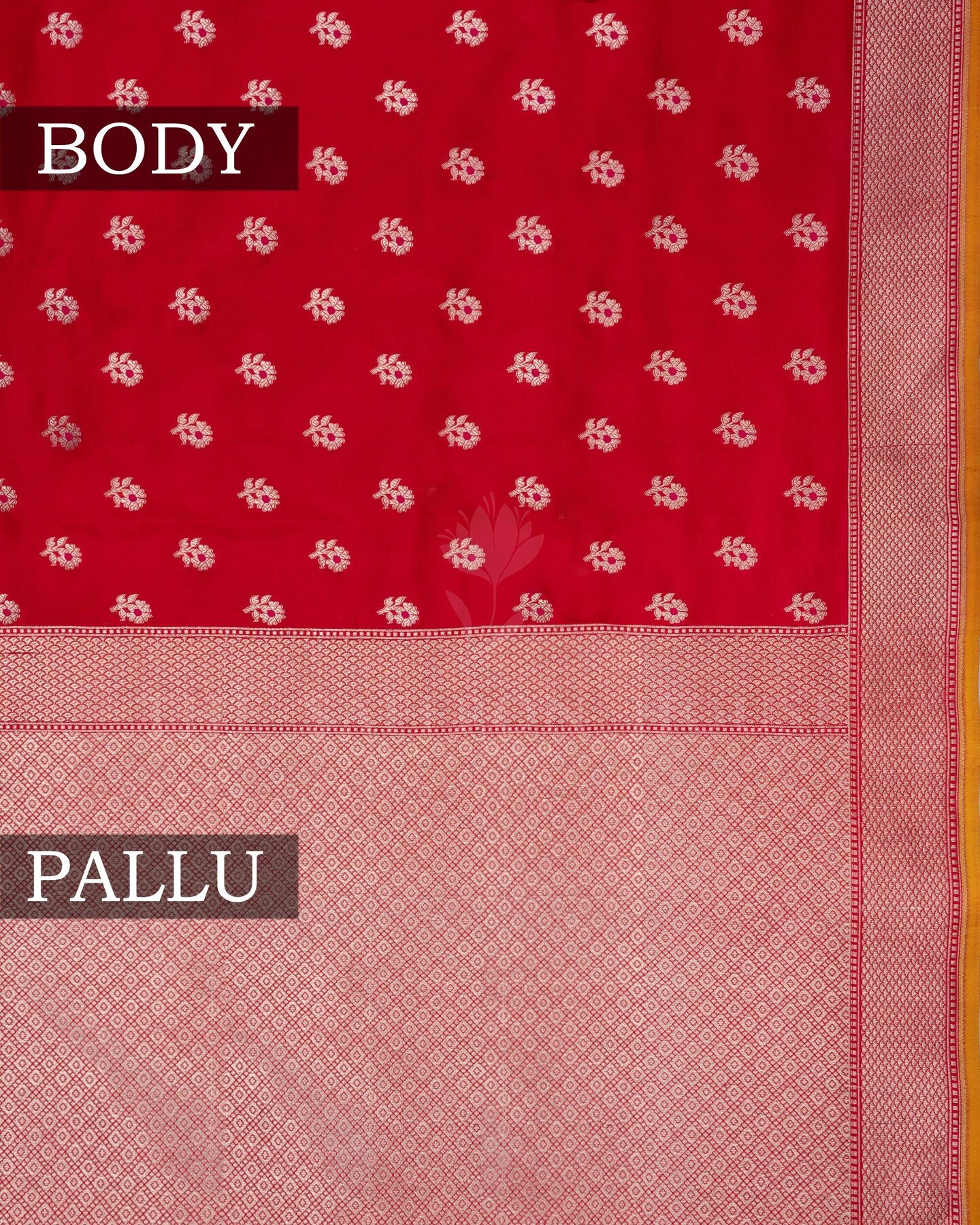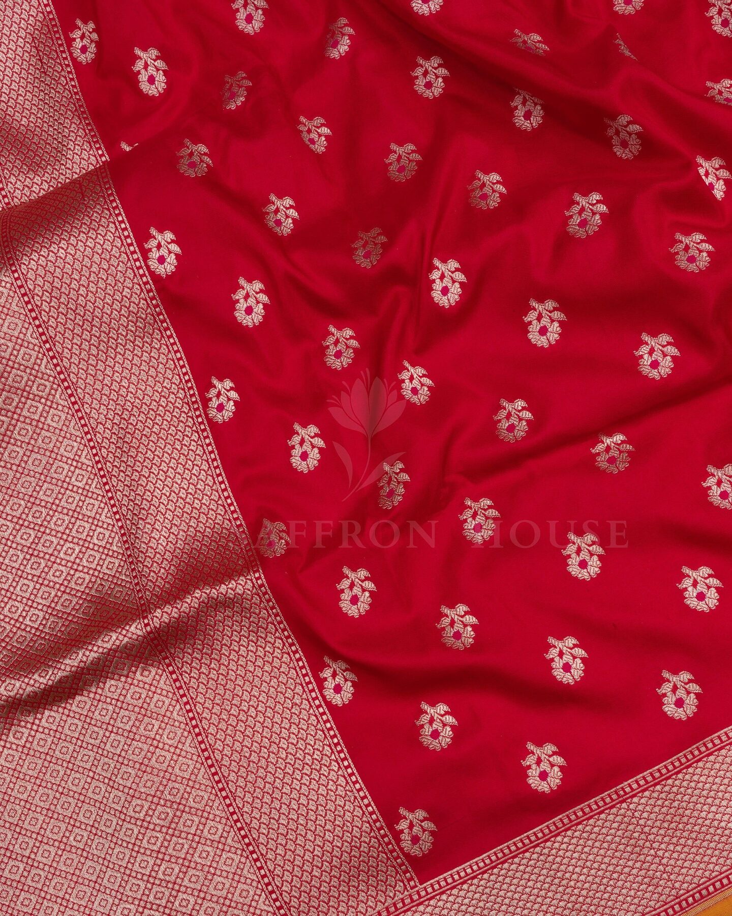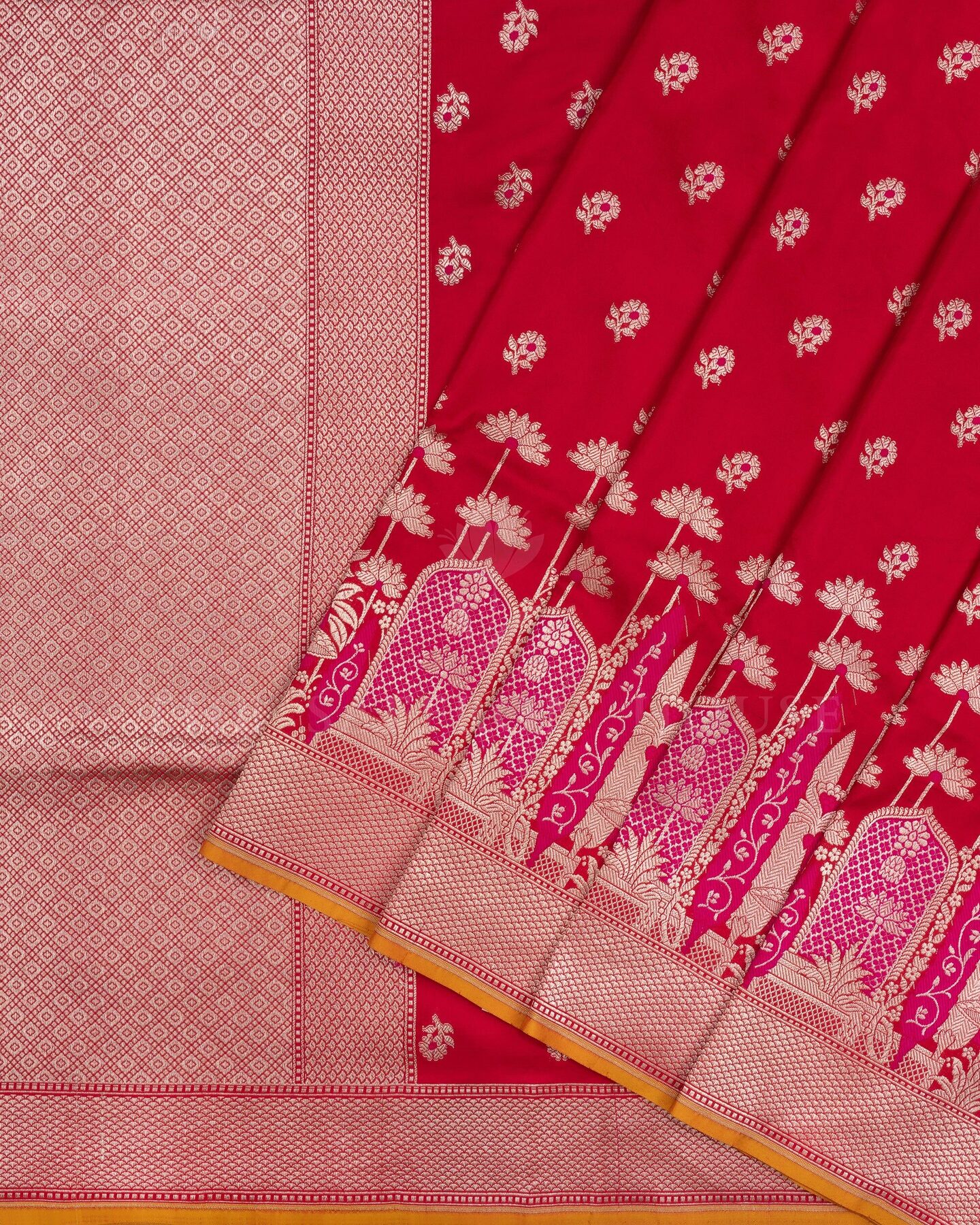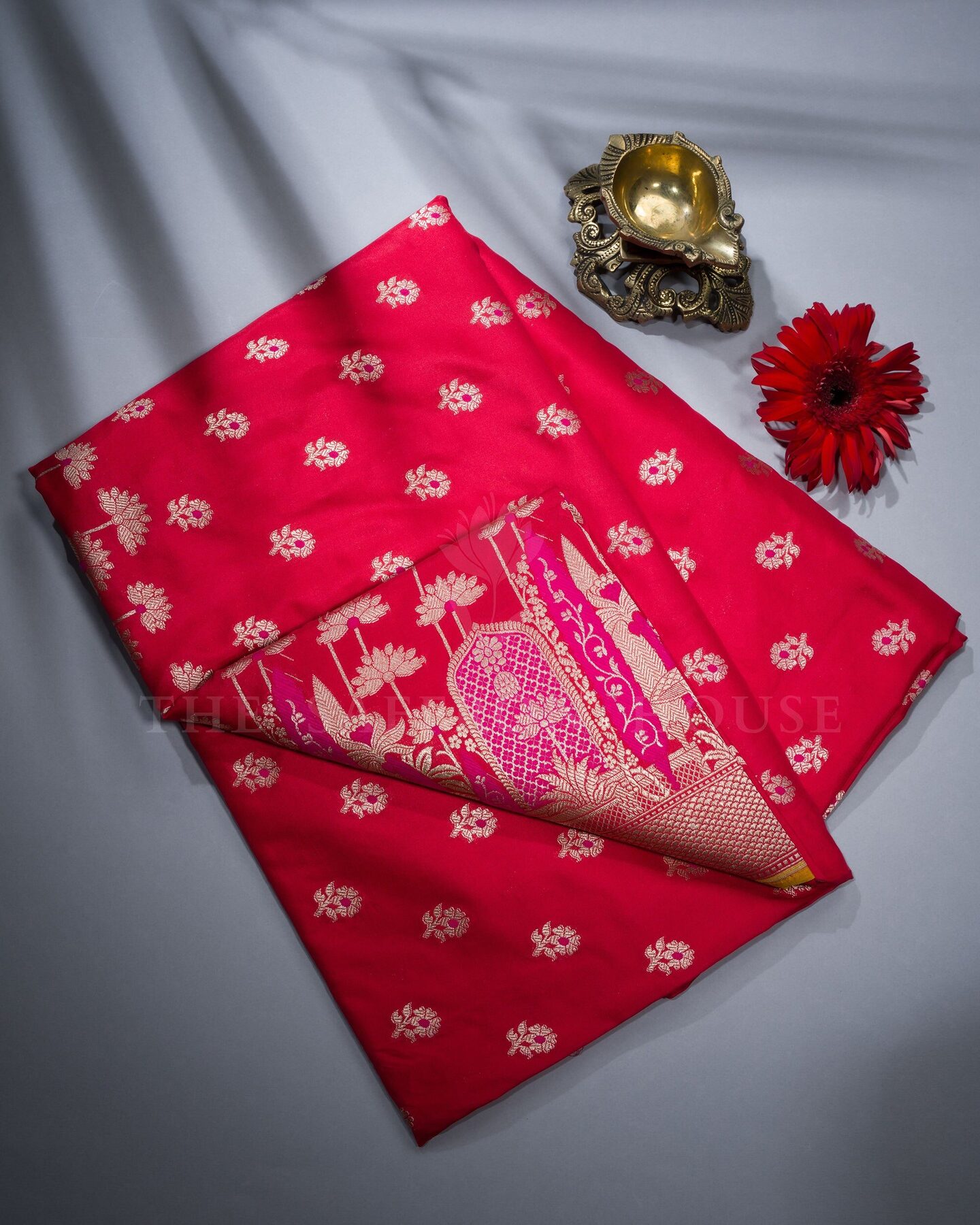 The body is adorned with small floral motifs, each thread placed with precision and purpose. The red border frames the drape with confident definition, while silver and gold zari runs through the weave, catching light the way temple gold does — slowly, deeply, unforgettably.