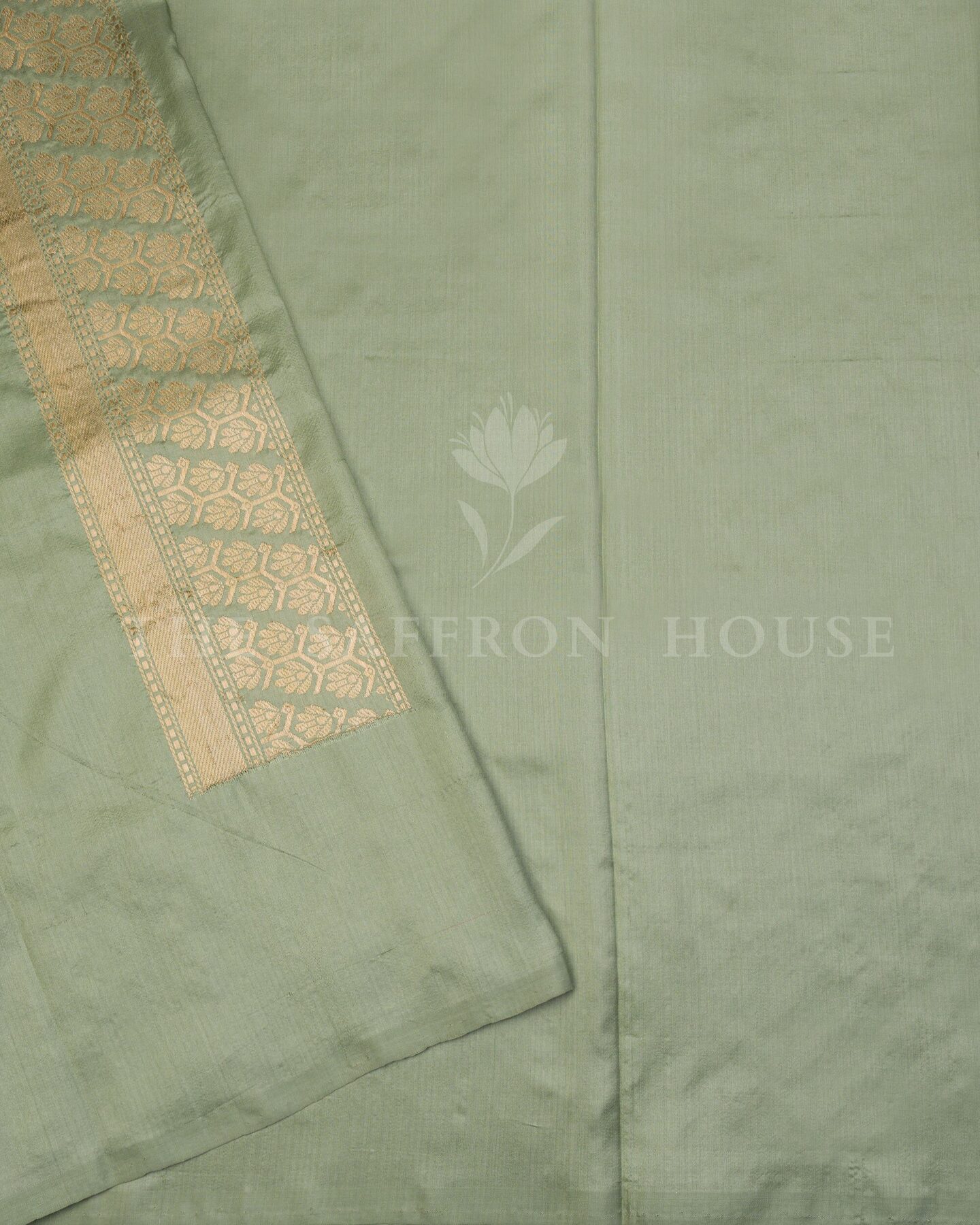 The body is woven with intricate traditional motifs, each thread placed with precision and purpose. A richly woven border frames the drape with confident definition, while antique zari runs through the weave, catching light the way temple gold does — slowly, deeply, unforgettably.