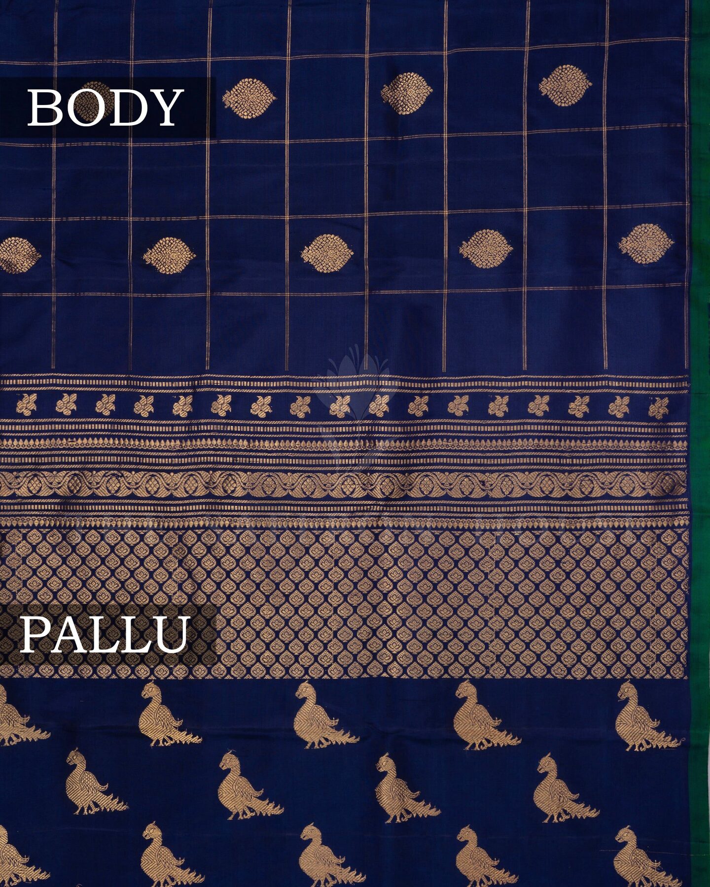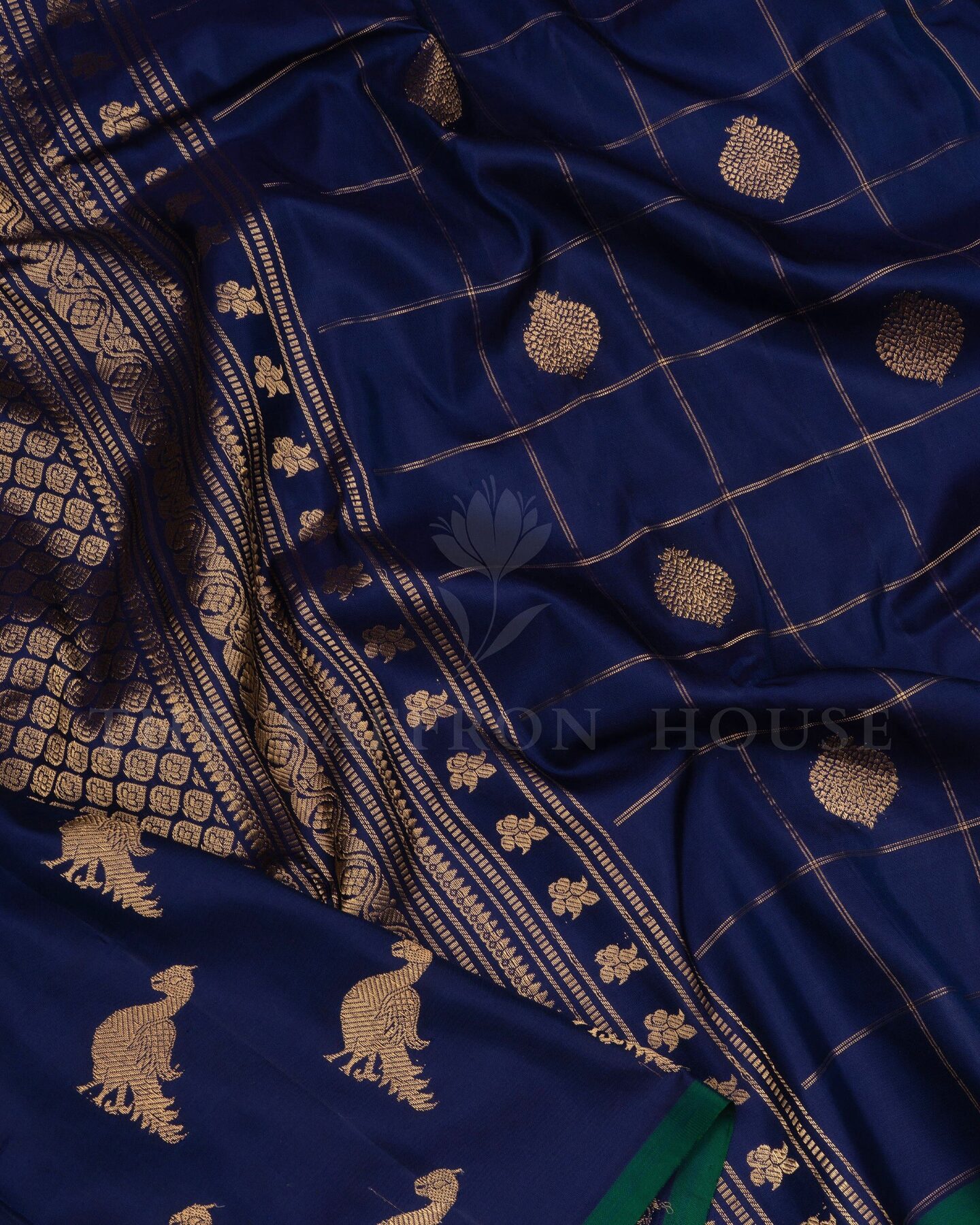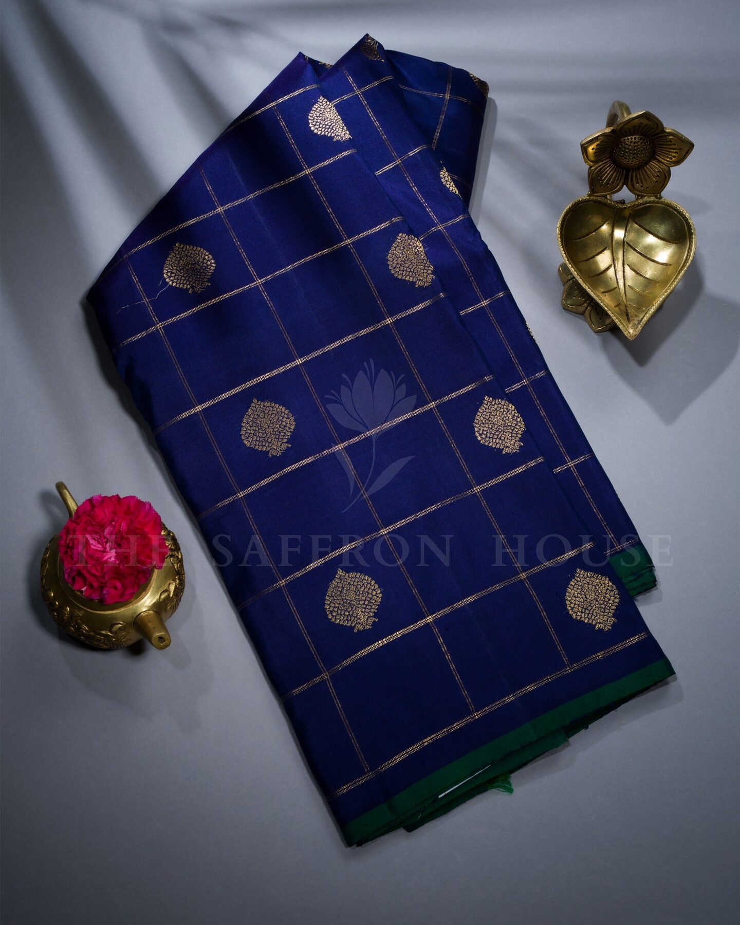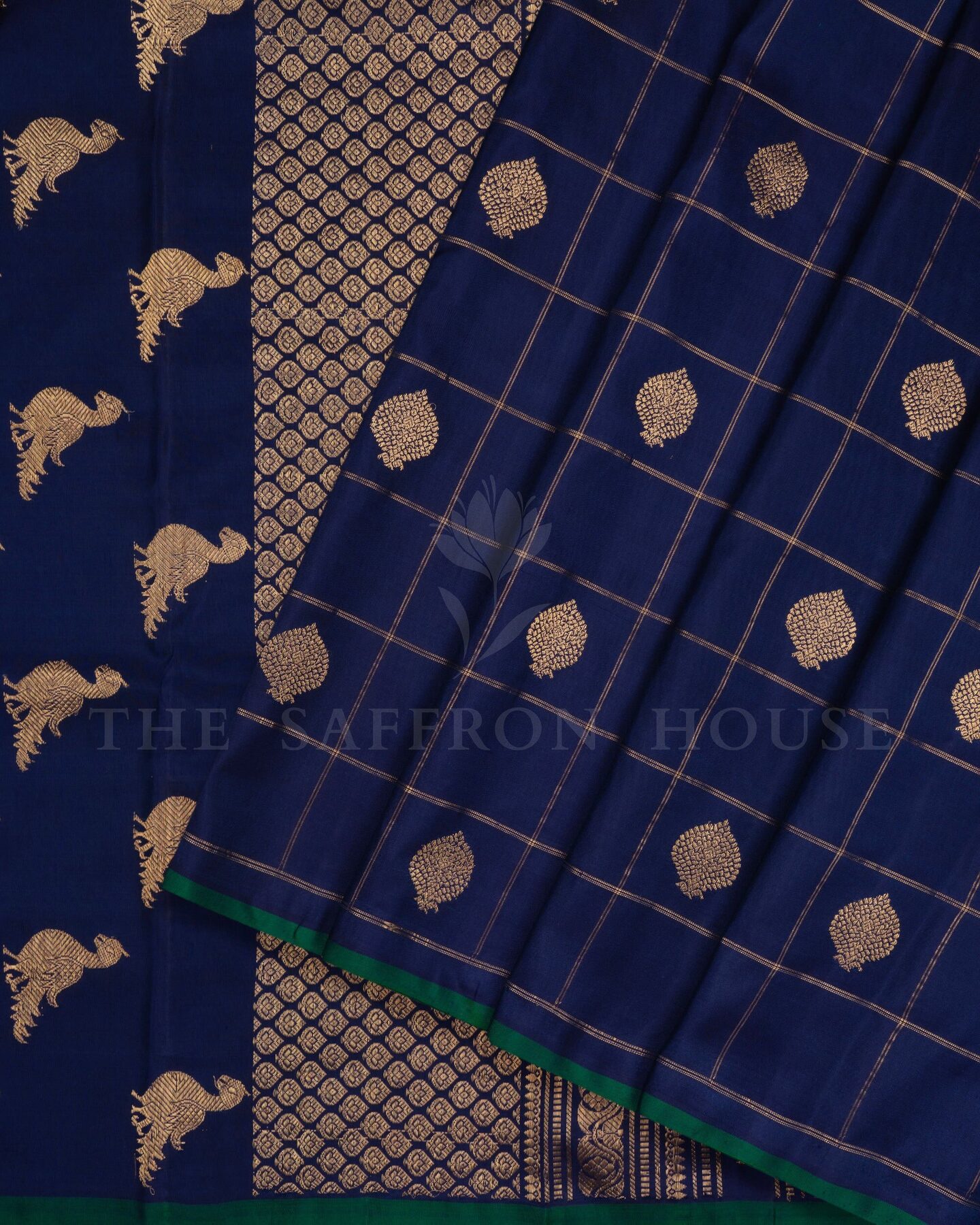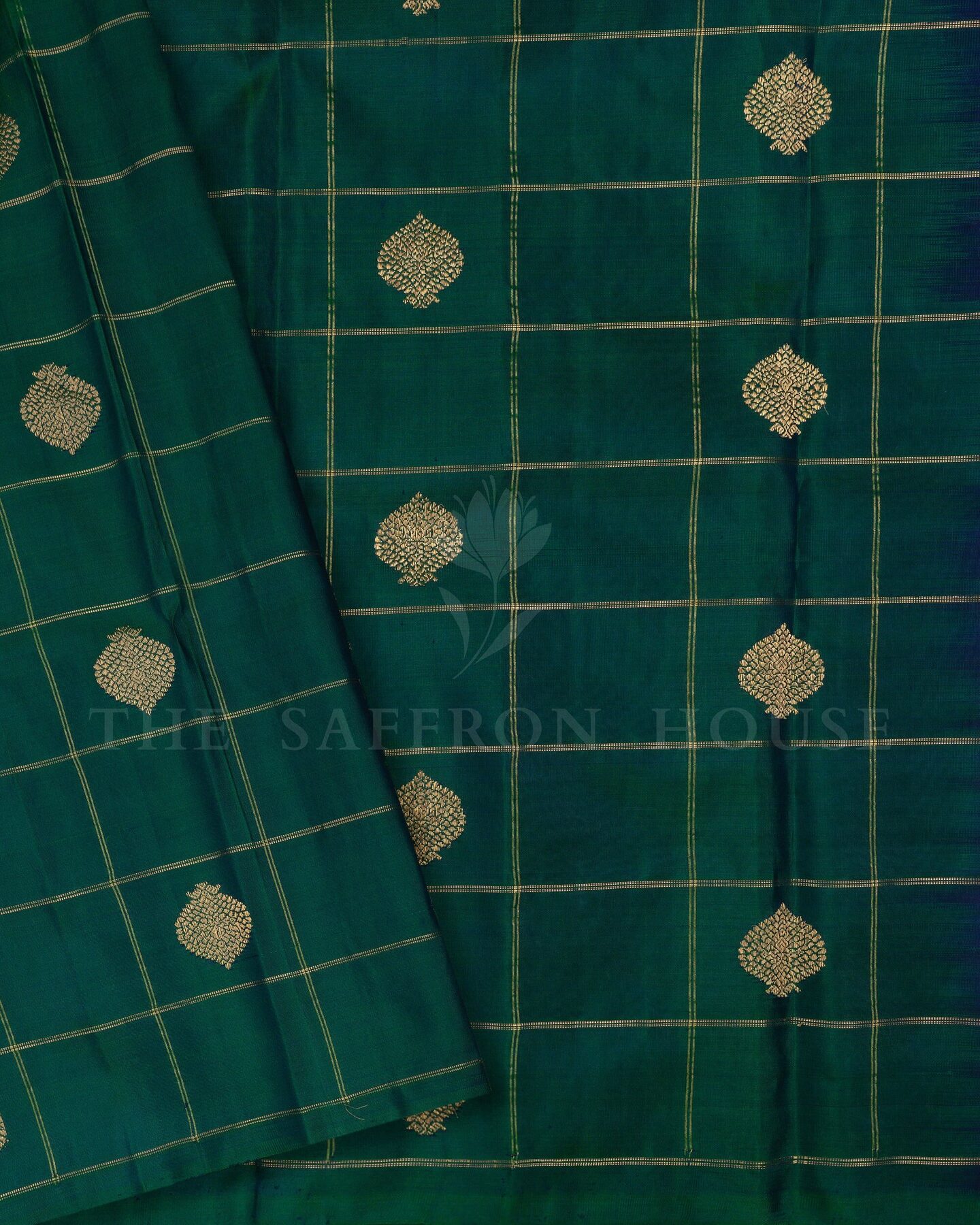 The body is adorned with golden zari leaf buttas with zari checks, each thread placed with precision and purpose. The without border border frames the drape with confident definition, while gold zari runs through the weave, catching light the way temple gold does — slowly, deeply, unforgettably.