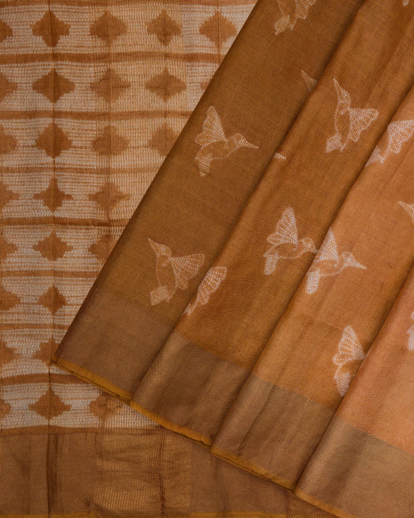 The body is adorned with bird motif shibori print, each thread placed with precision and purpose. The self border frames the drape with confident definition, while gold zari runs through the weave, catching light the way temple gold does — slowly, deeply, unforgettably.