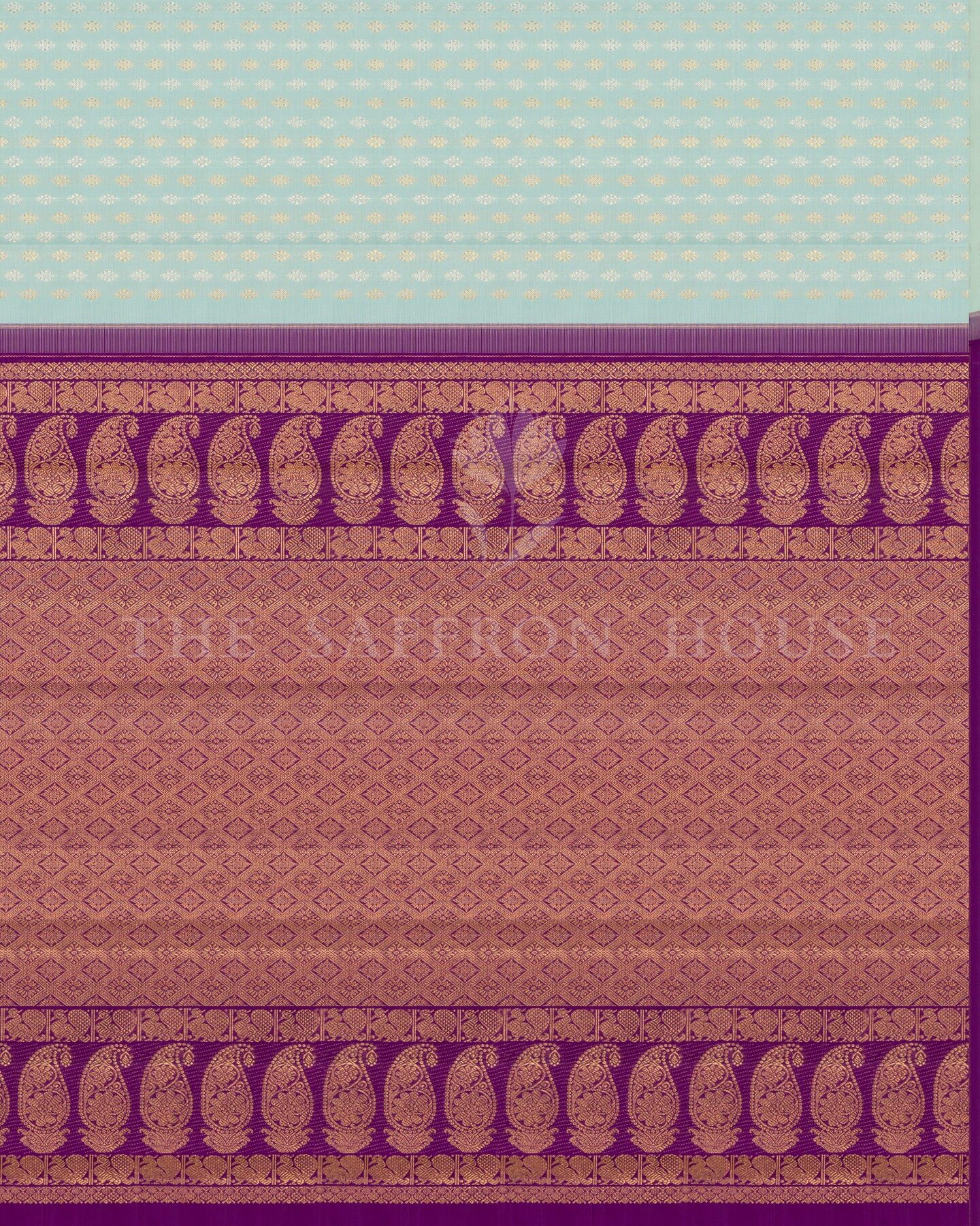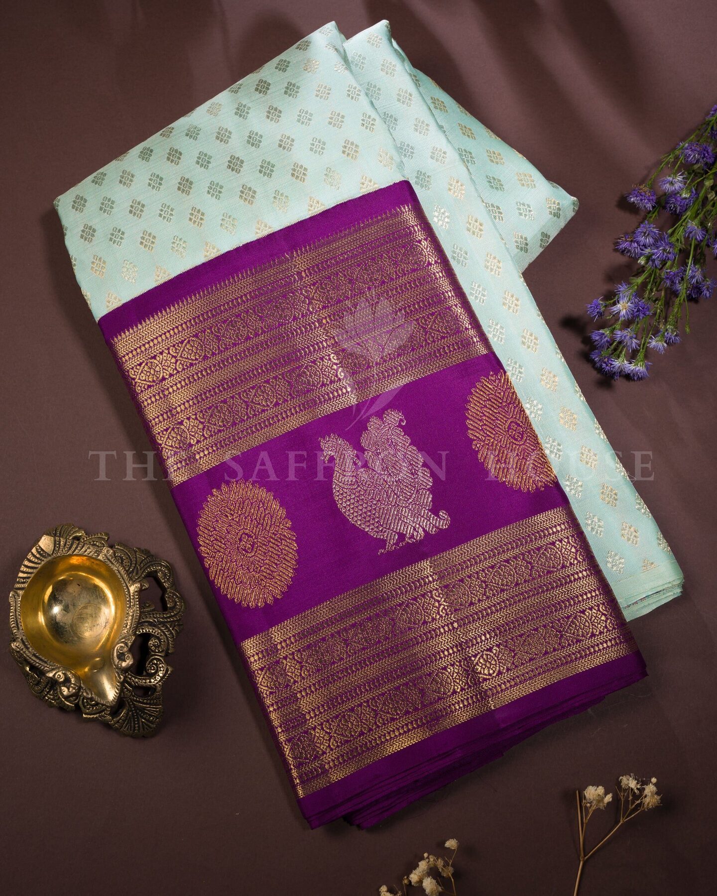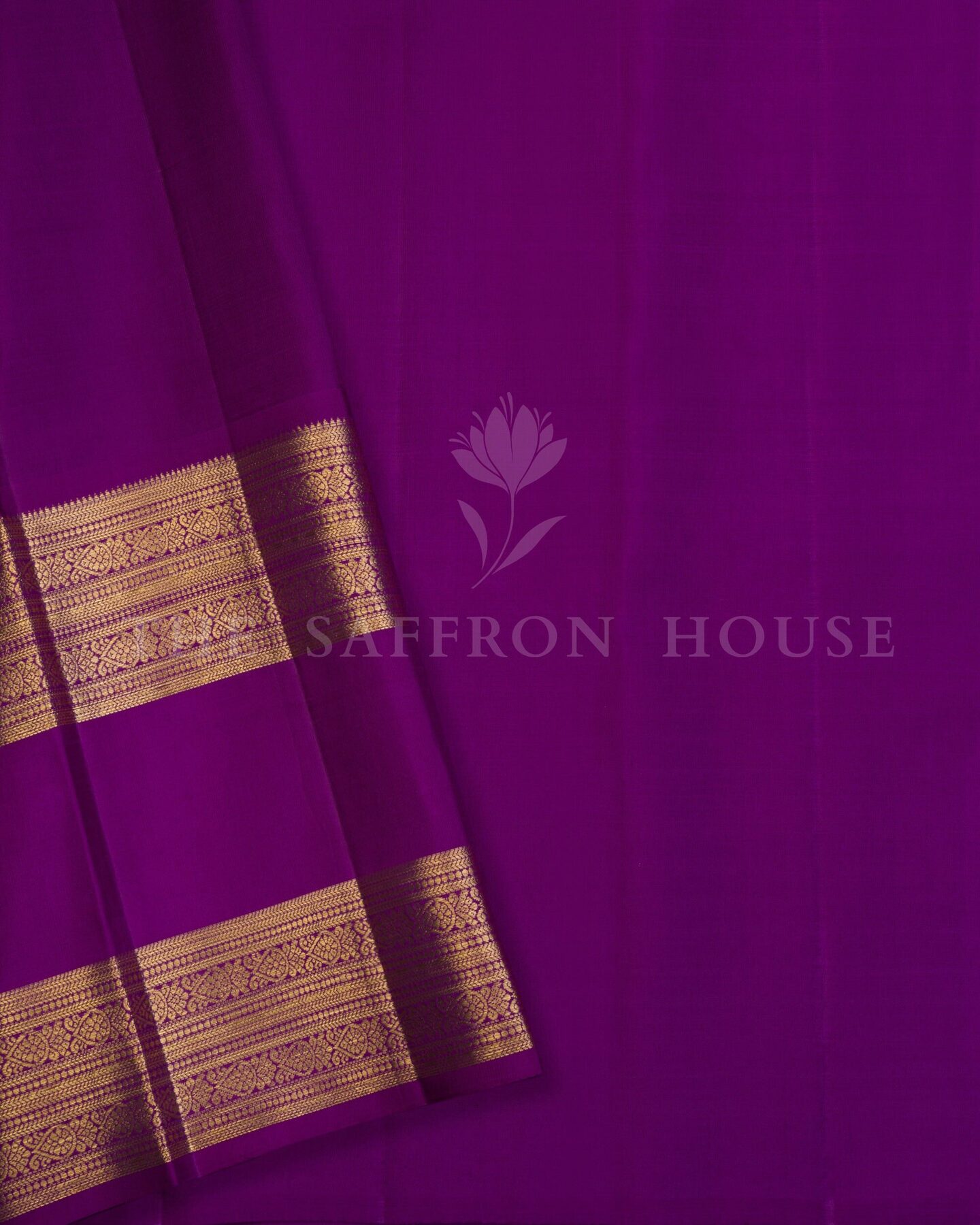 There is something about the interplay of sky blue and purple that feels both ancient and alive. This Handwoven Kanjivaram silk saree opens with radiant in its own quiet way, its surface shimmering with the unhurried rhythm of the loom.