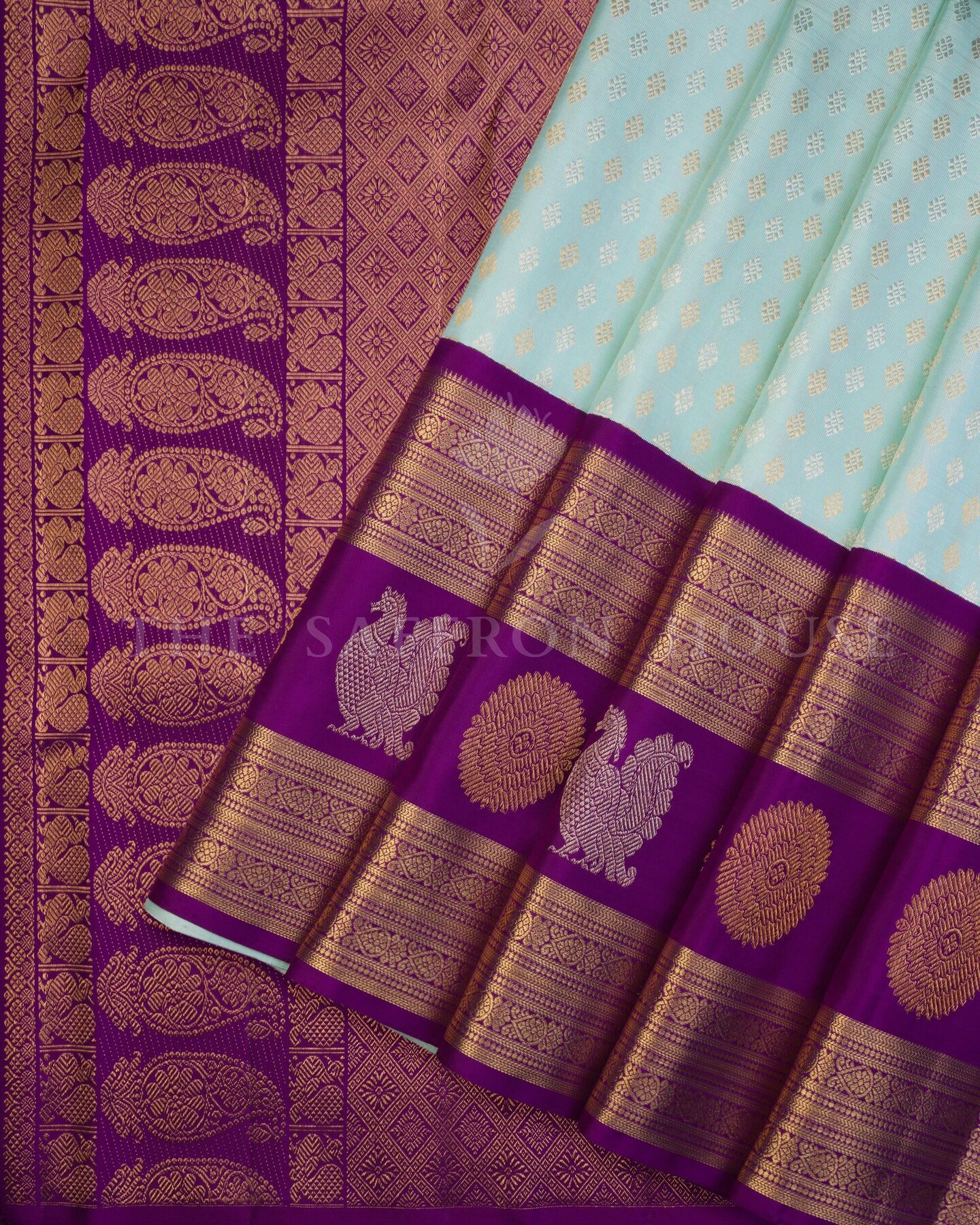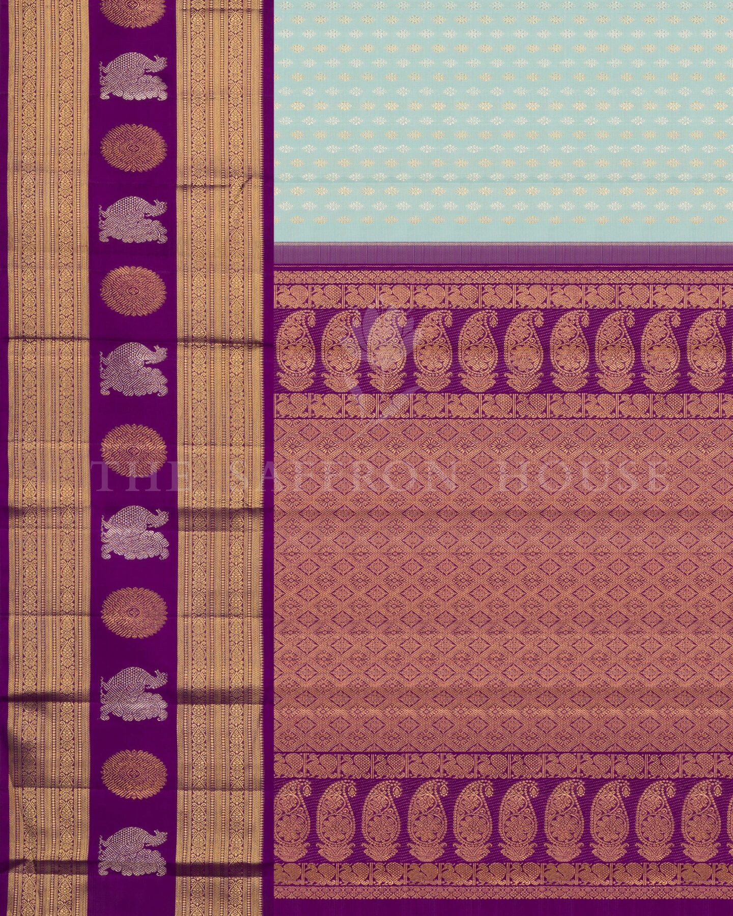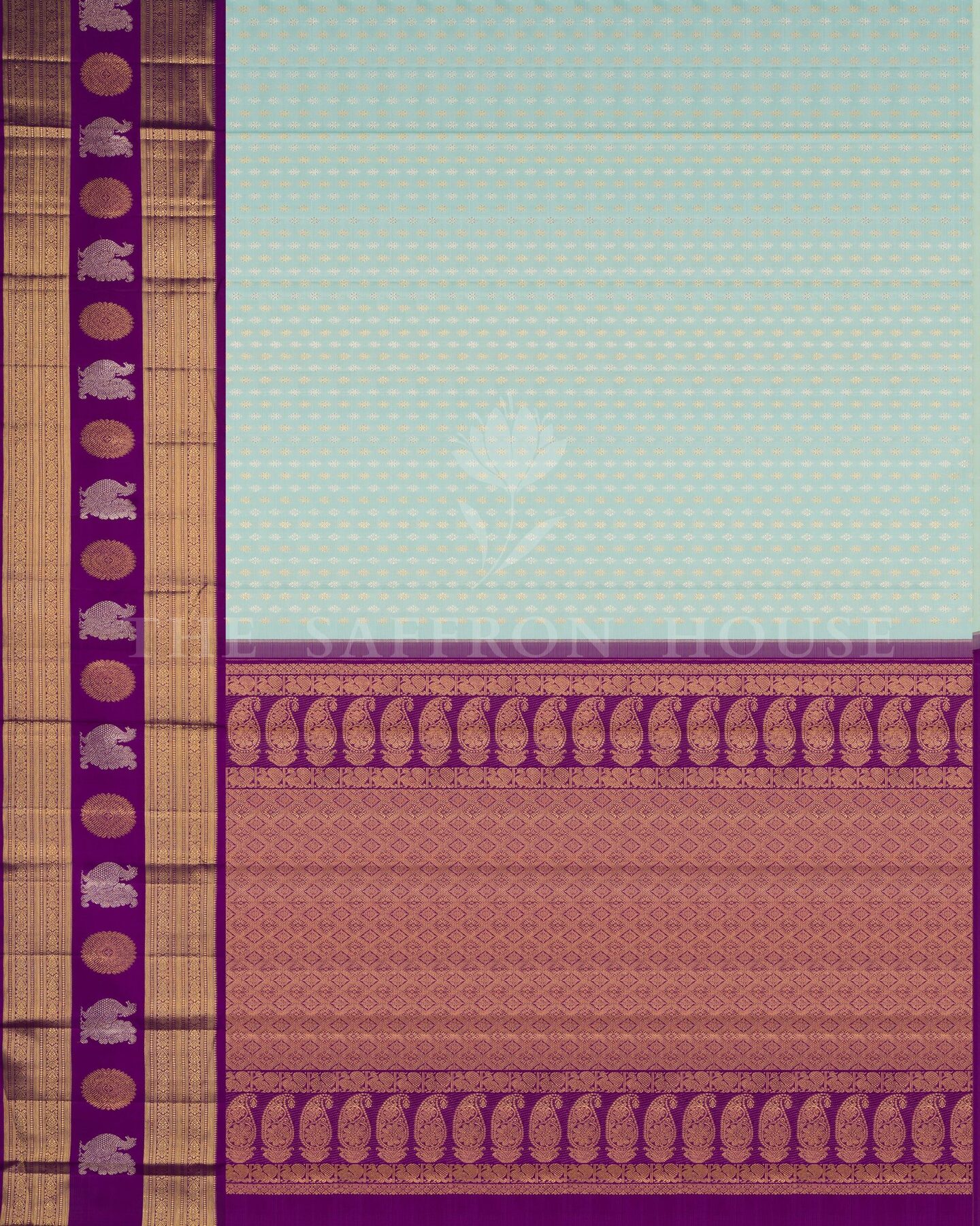 There is something about the interplay of sky blue and purple that feels both ancient and alive. This Handwoven Kanjivaram silk saree opens with radiant in its own quiet way, its surface shimmering with the unhurried rhythm of the loom.