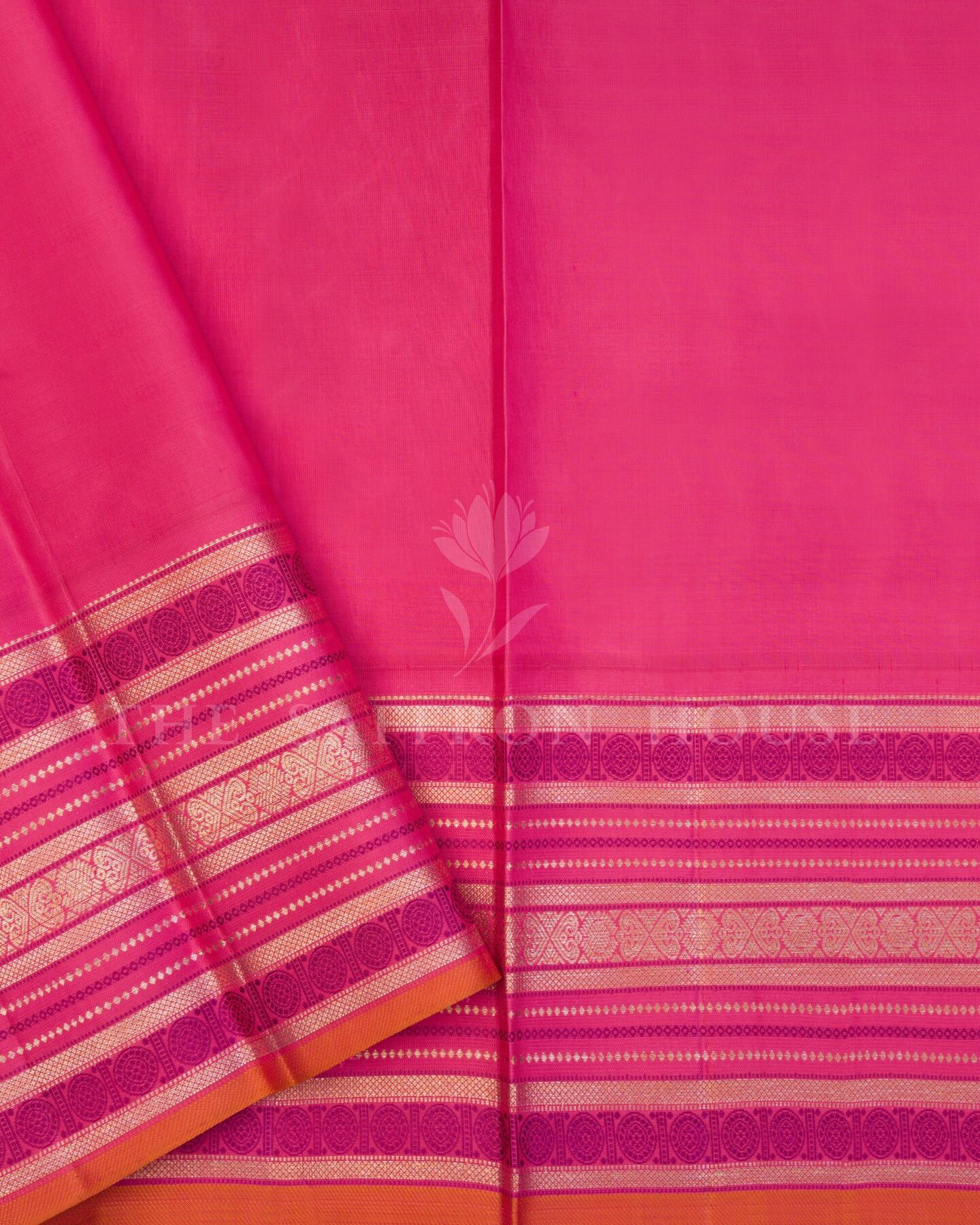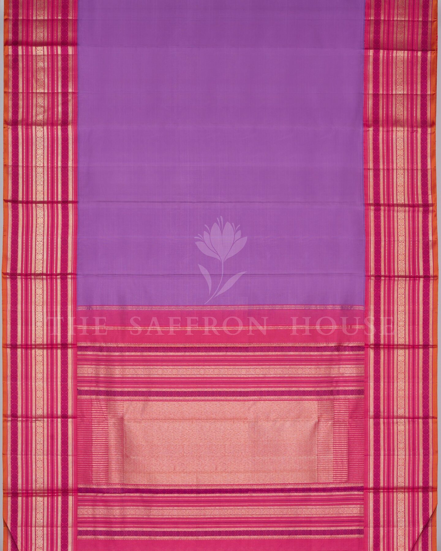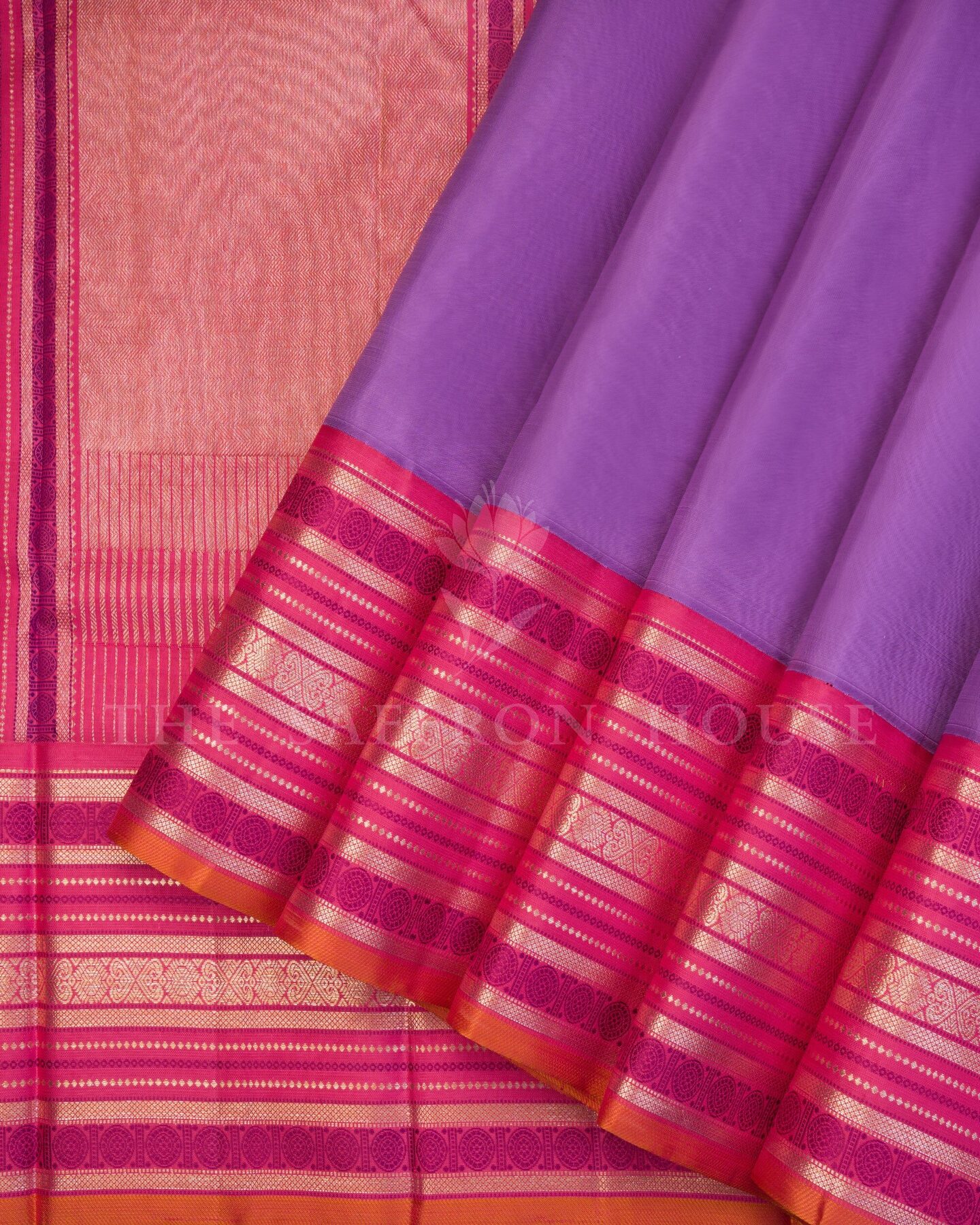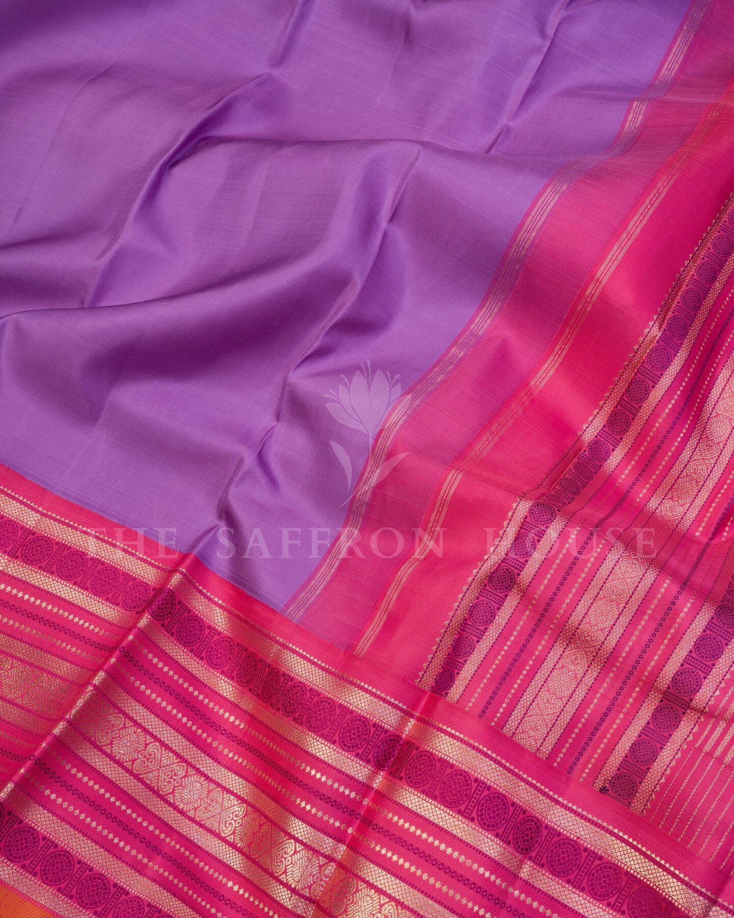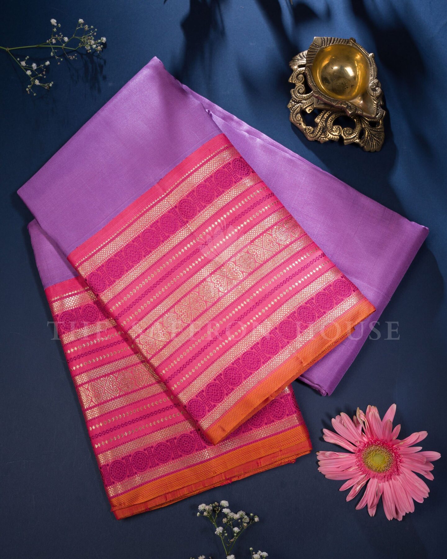 There is something about the interplay of lavender and pink that feels both ancient and alive. This Handwoven Kanjivaram silk saree opens with soft as freshly gathered flowers, its surface shimmering with the unhurried rhythm of the loom.