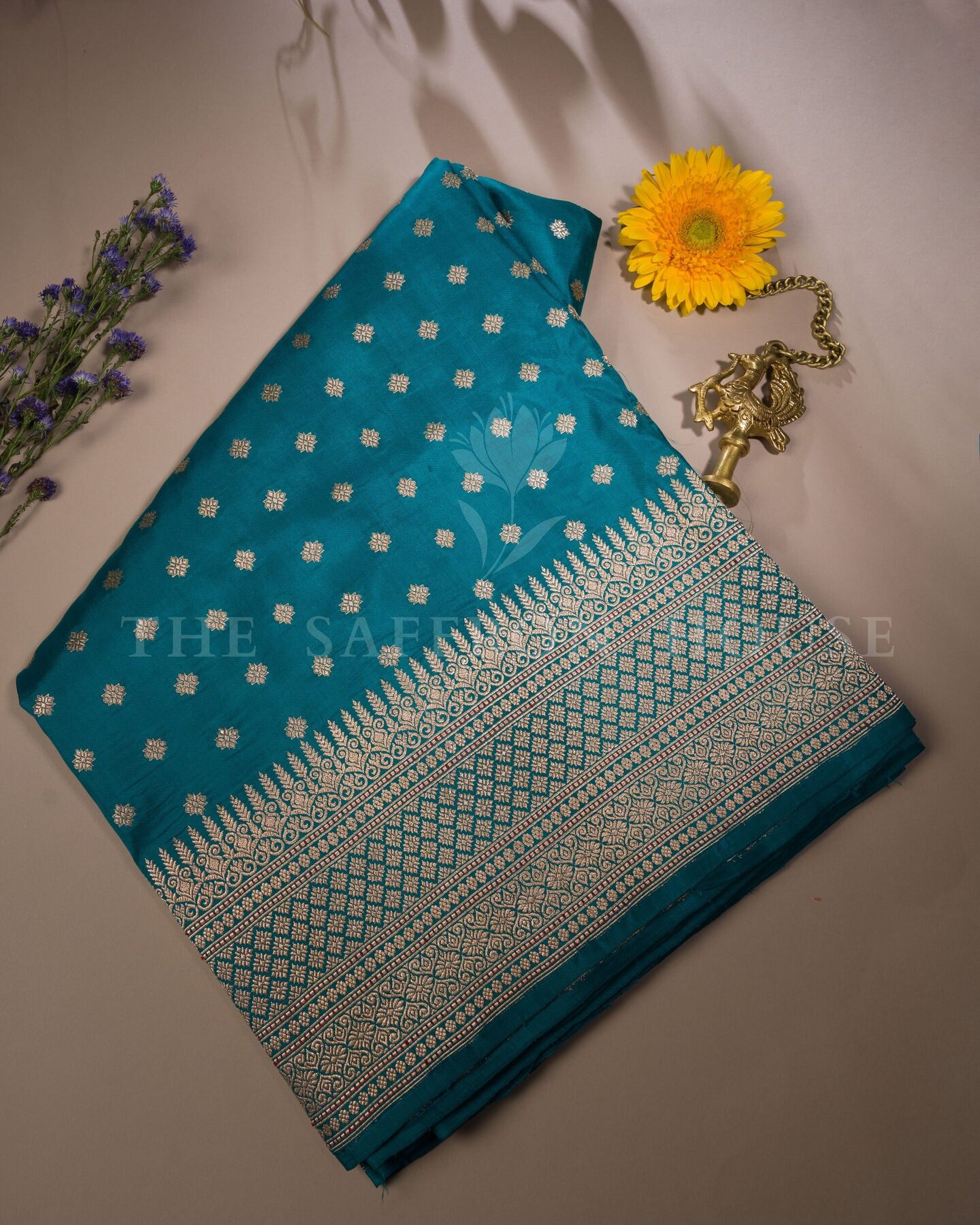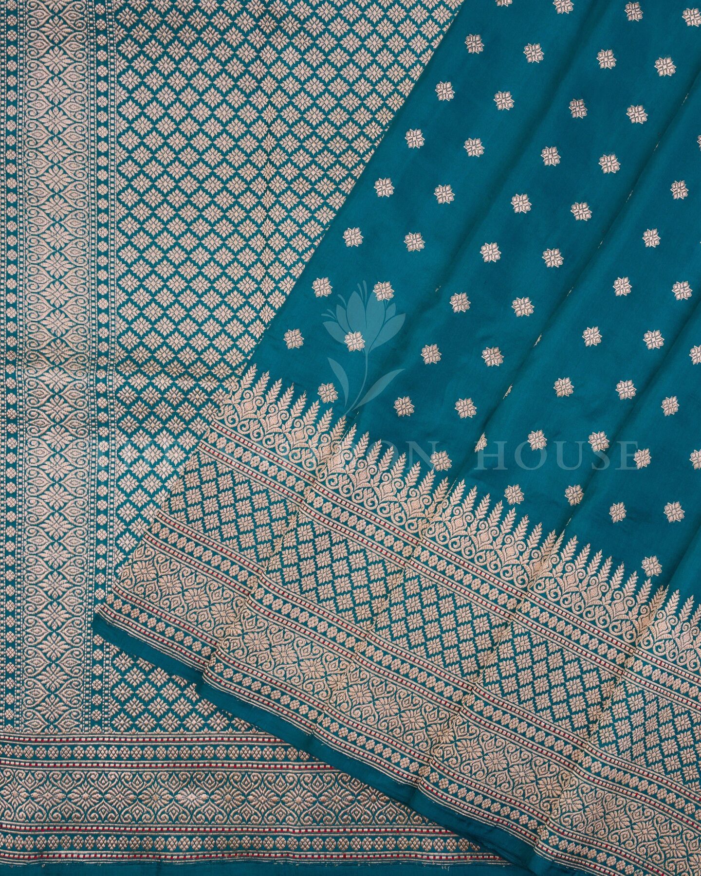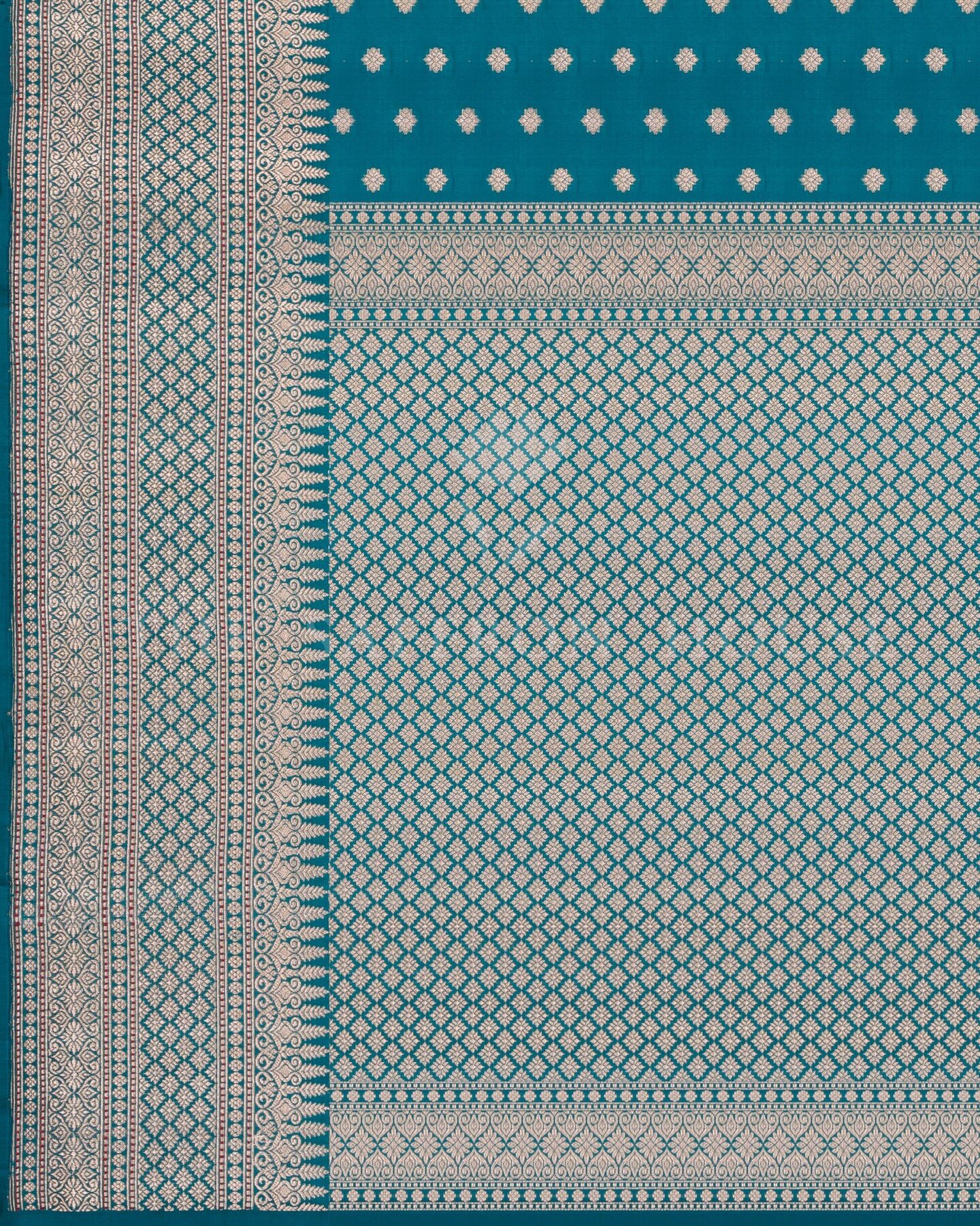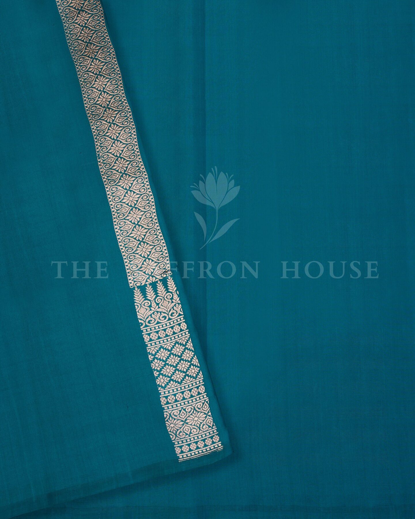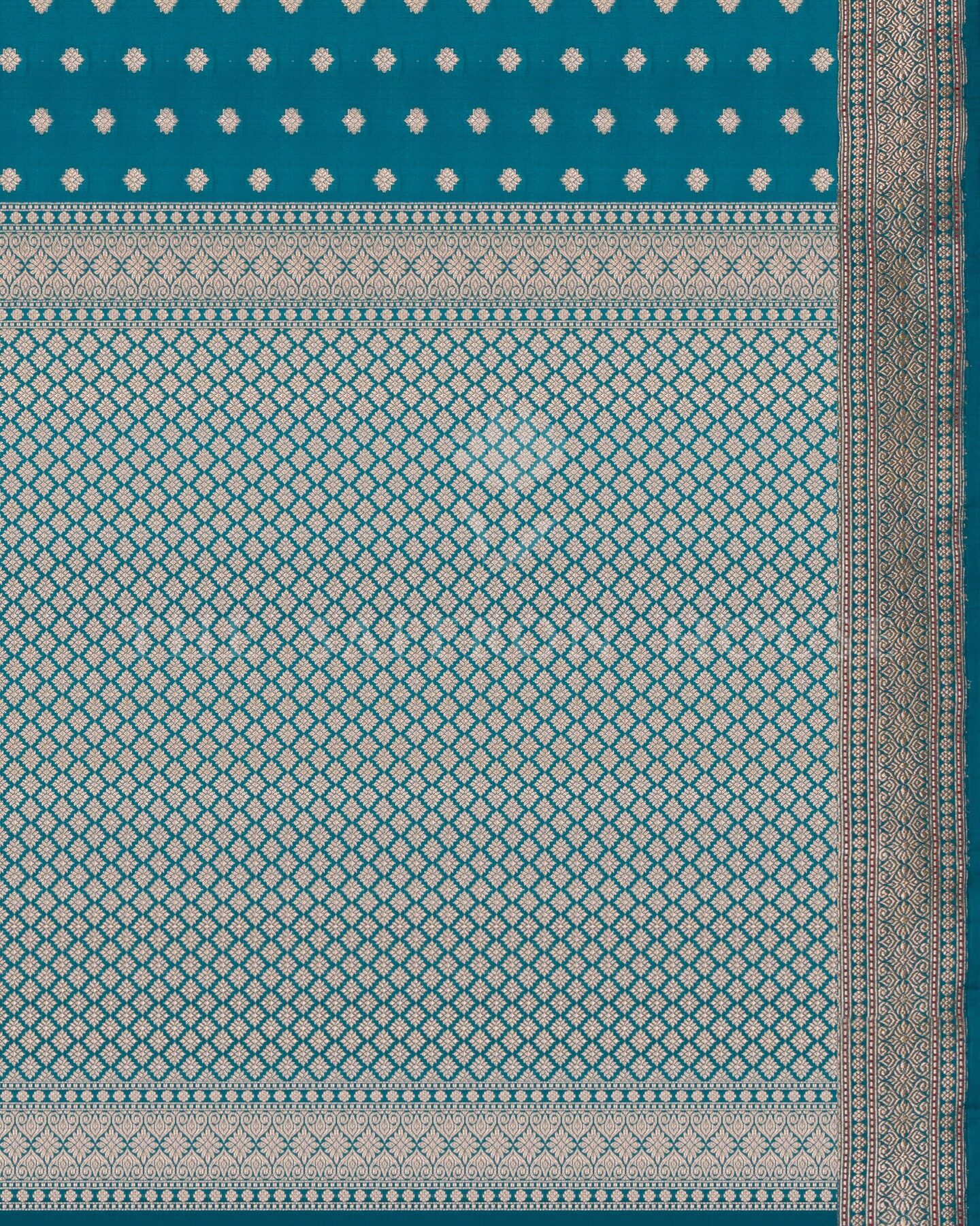 Some colours hold memory. Teal — the colour where sea meets sky — becomes something entirely new when woven into pure Kanjivaram silk. This Jaal saree carries that colour with quiet authority and grace.