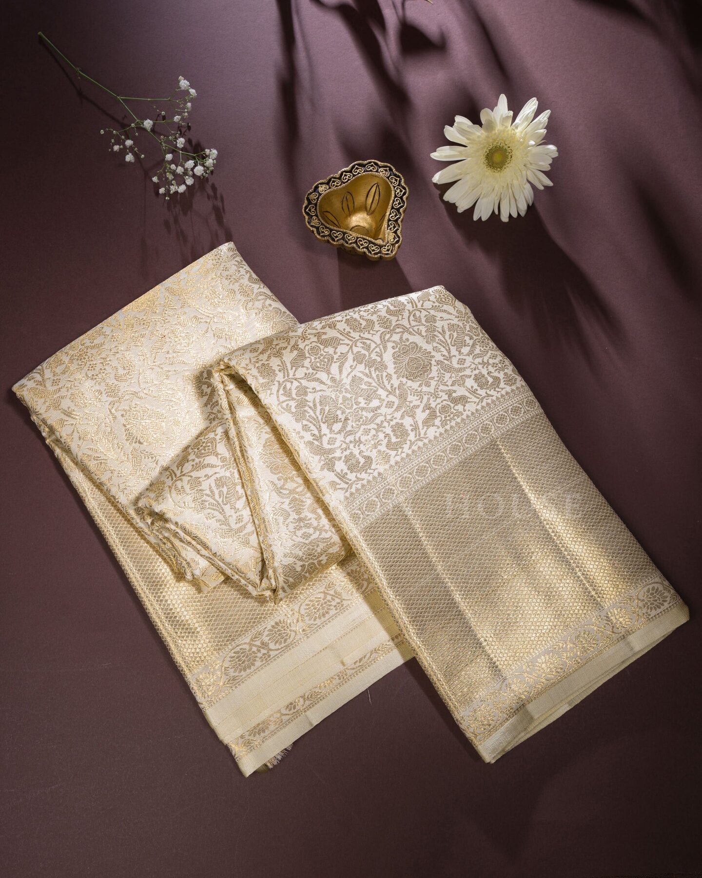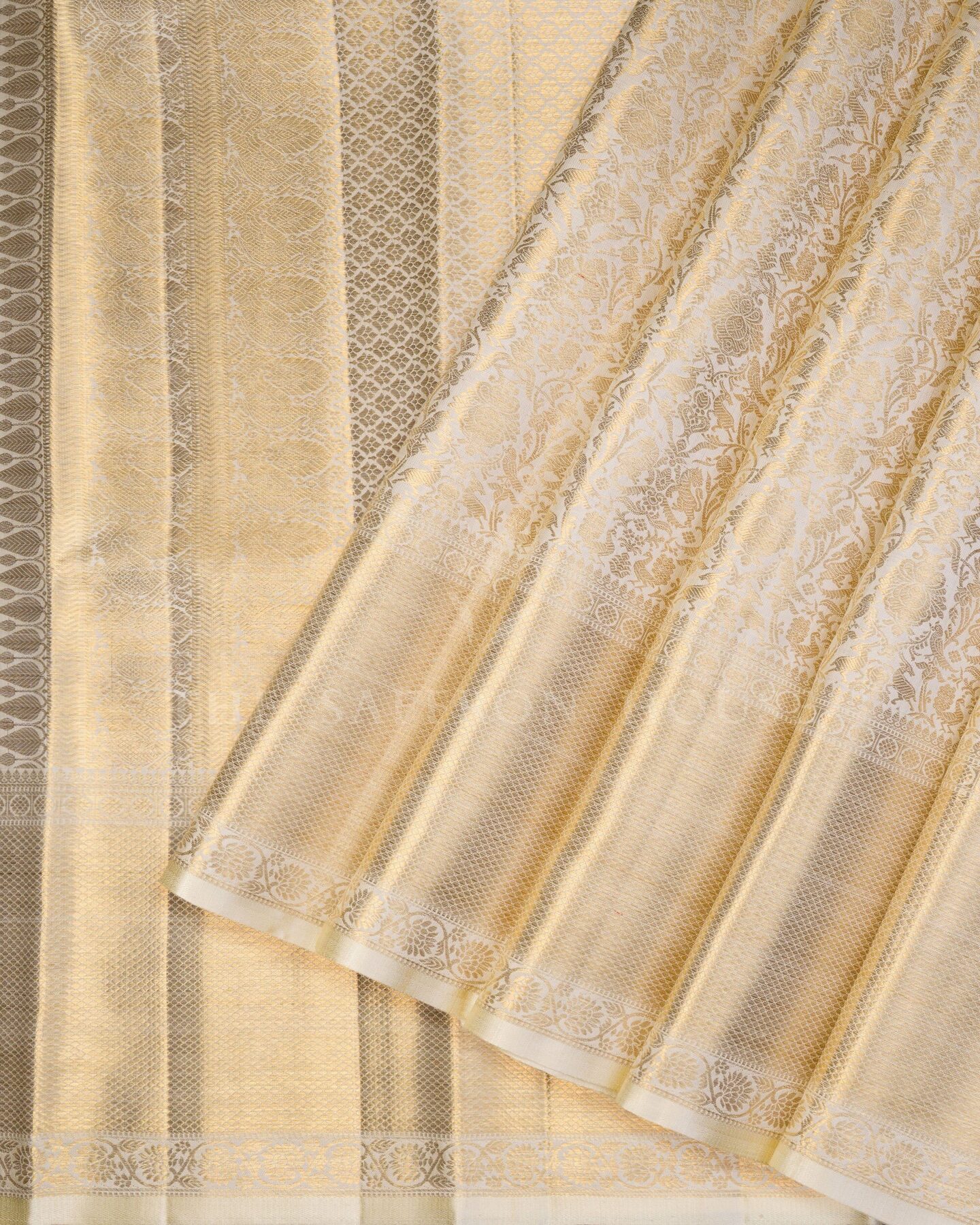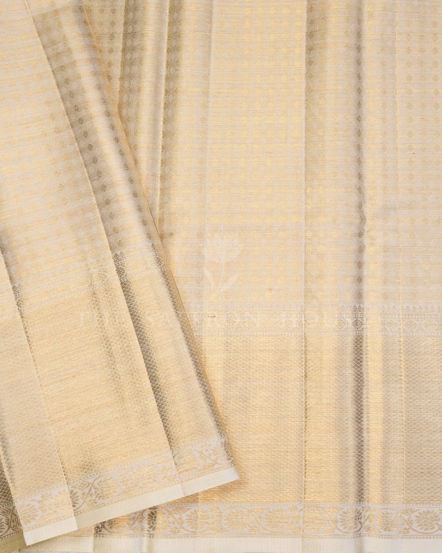 Some colours hold memory. Ivory — timeless as heirloom milk silk — becomes something entirely new when woven into pure Kanjivaram silk. This Handwoven saree carries that colour with quiet authority and grace.