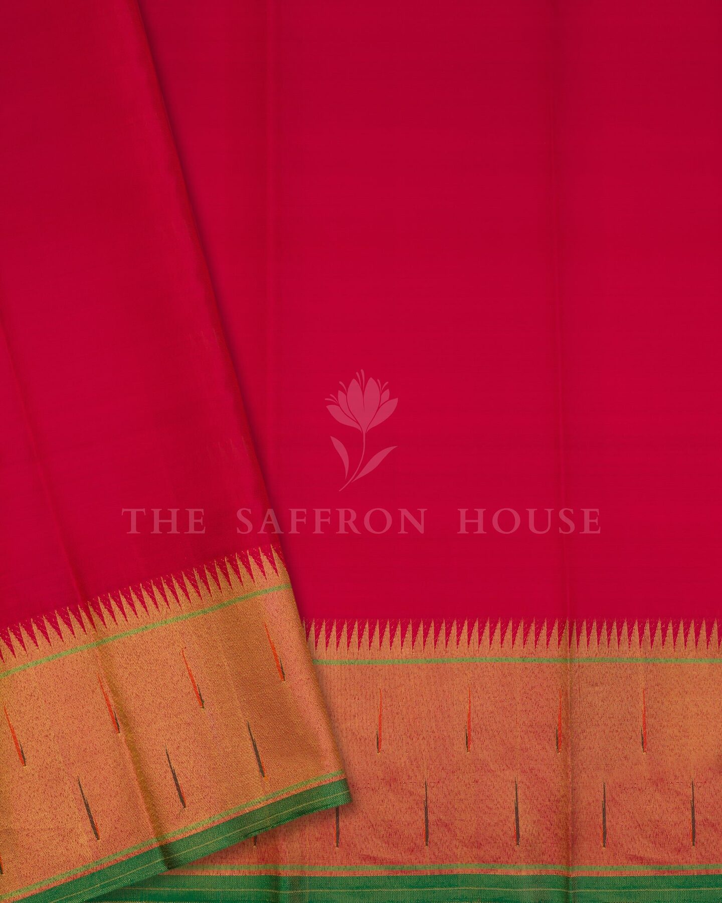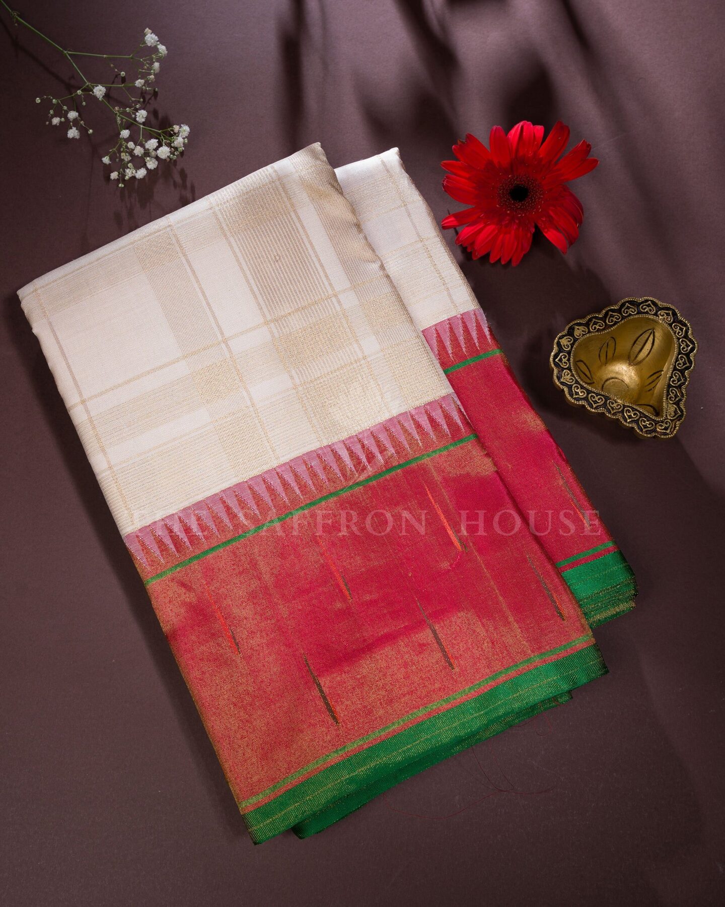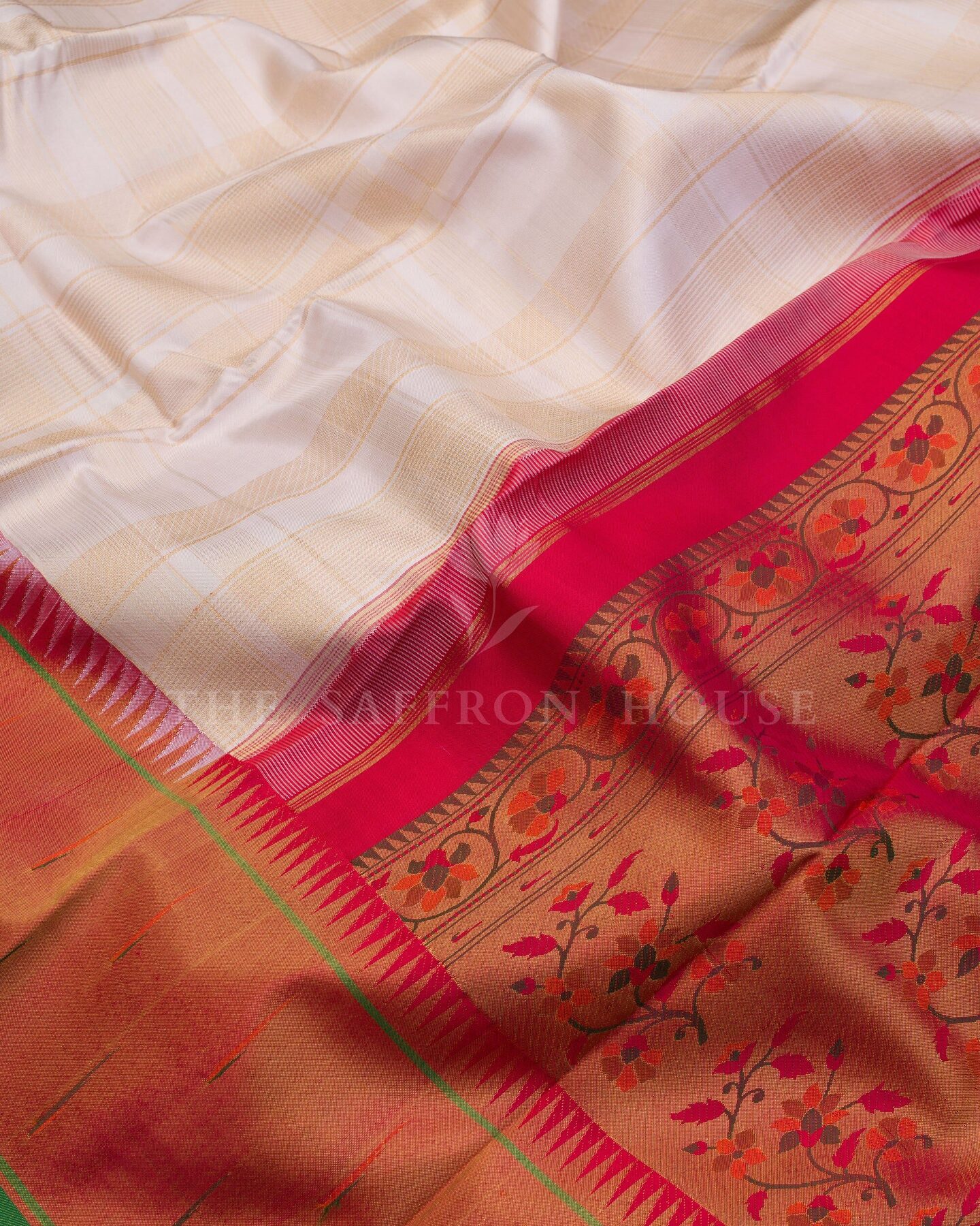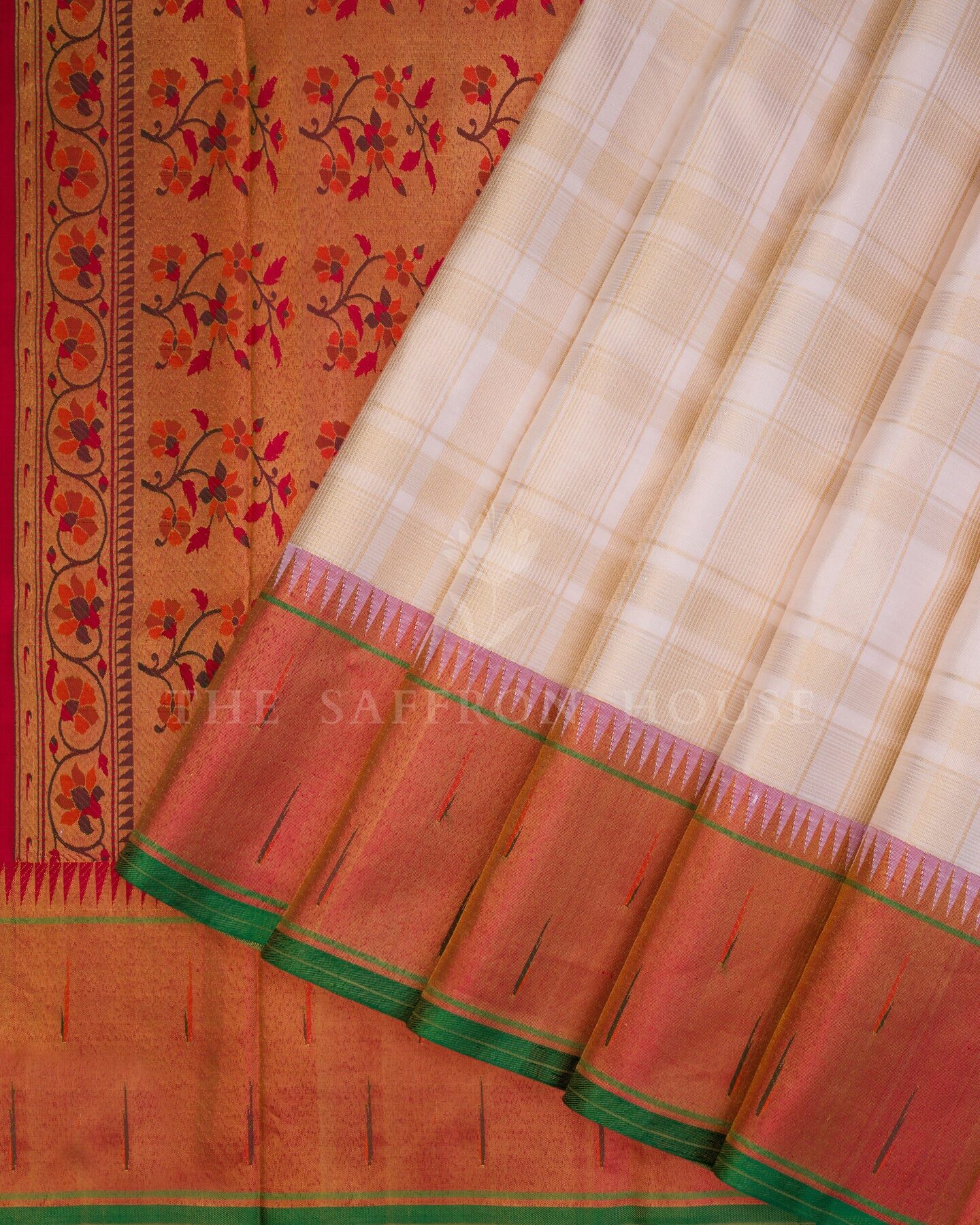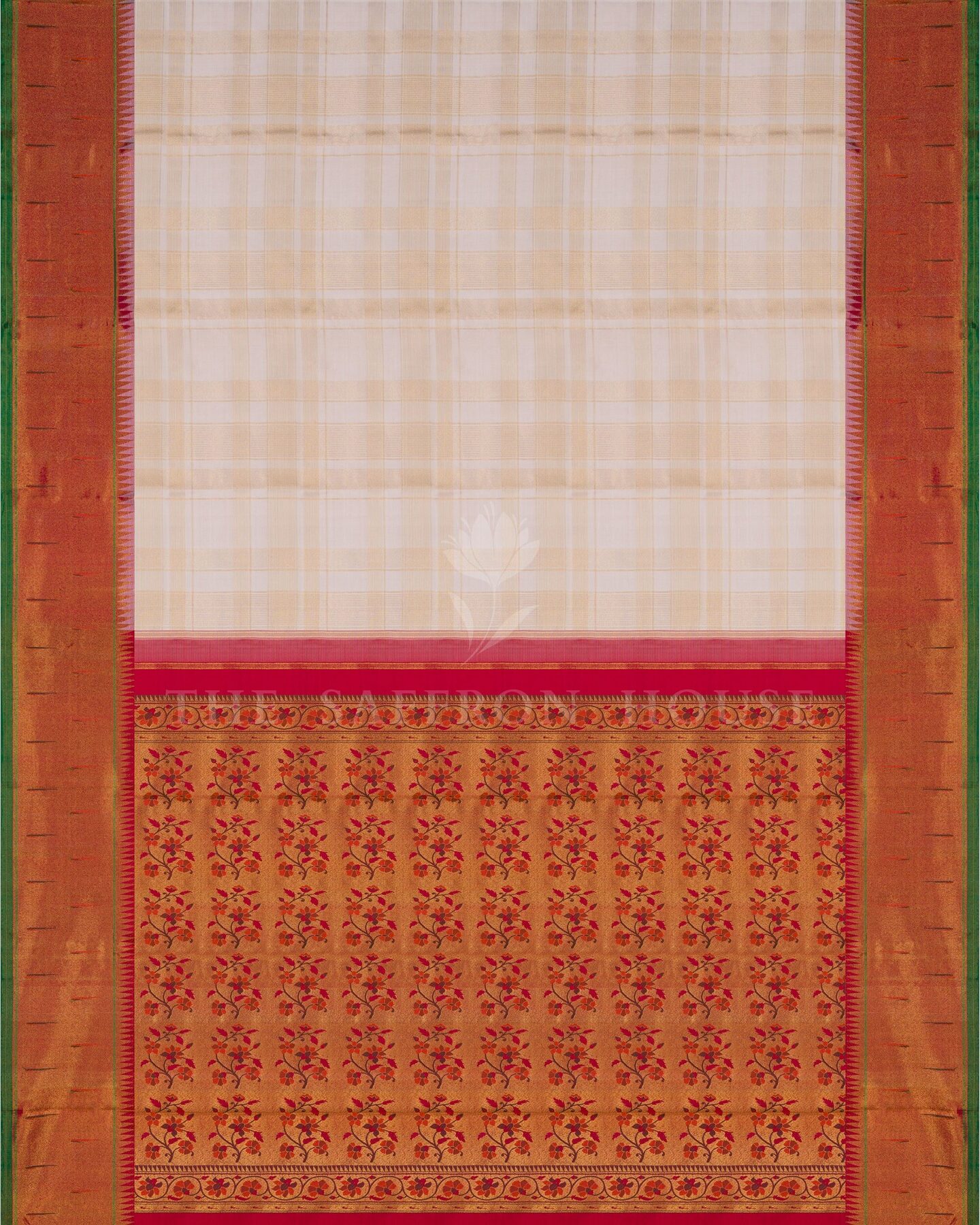 There is something about the interplay of off white and rust orange that feels both ancient and alive. This Paithani Kanjivaram silk saree opens with radiant in its own quiet way, its surface shimmering with the unhurried rhythm of the loom.