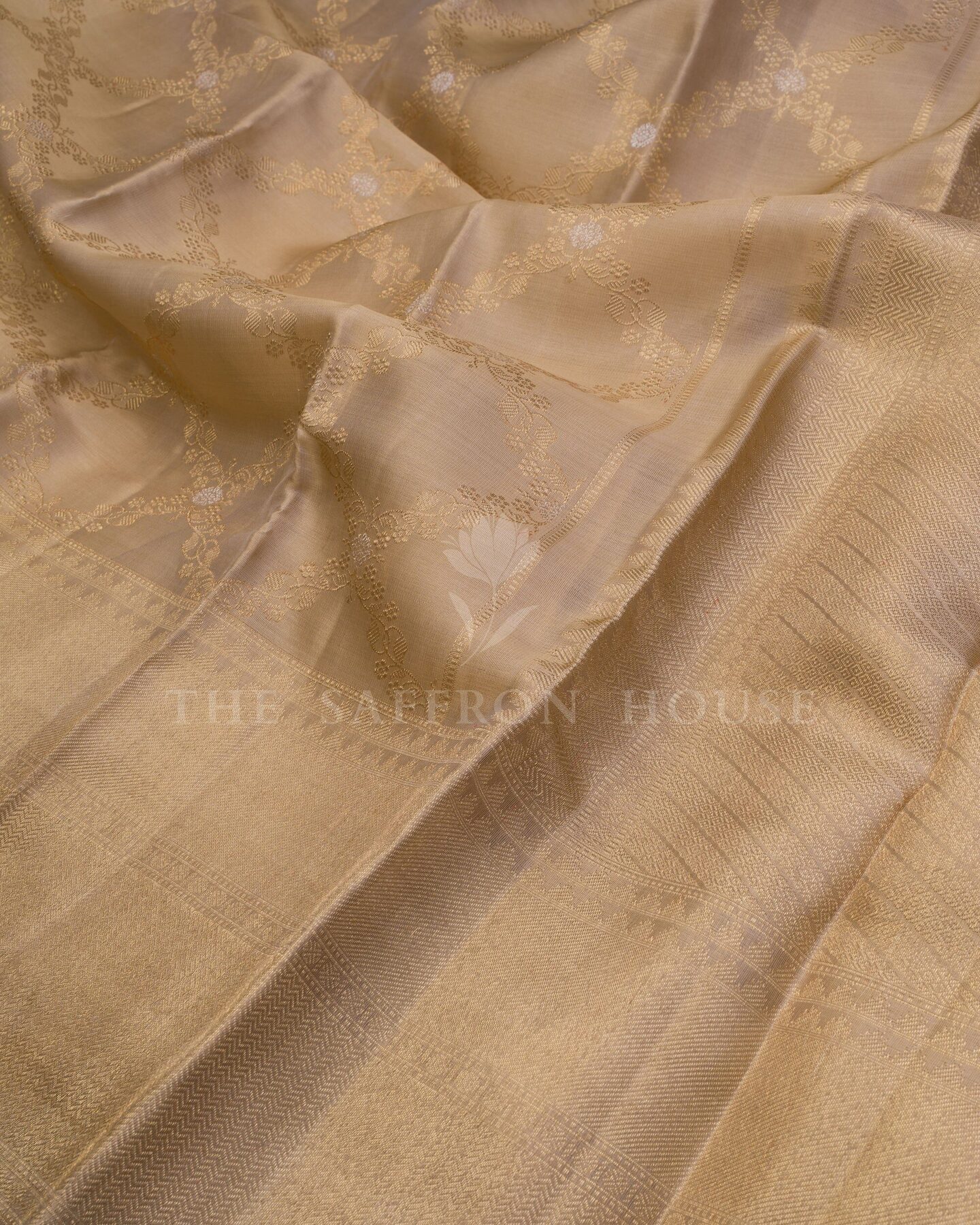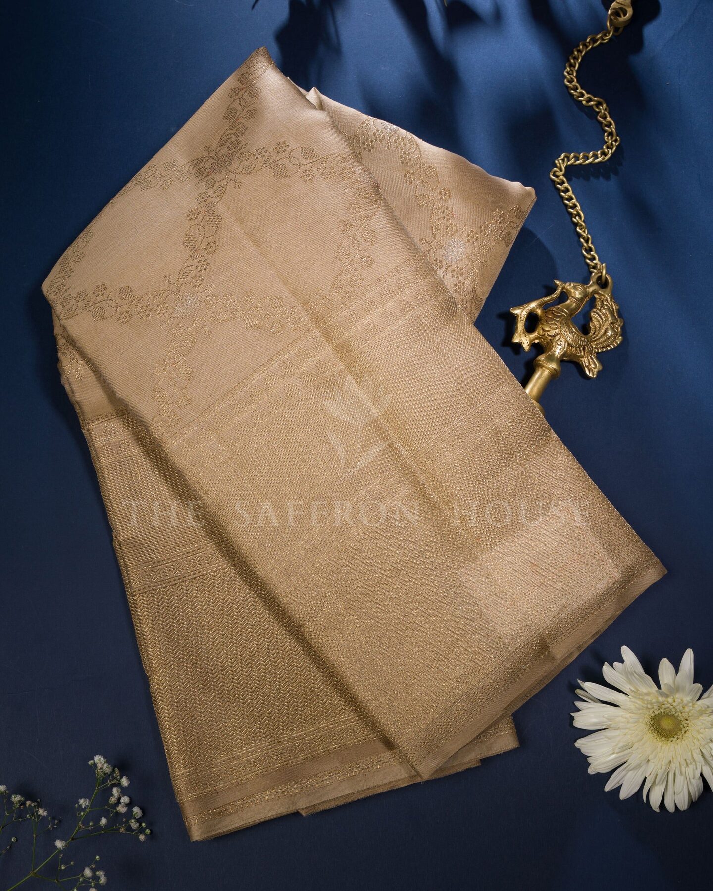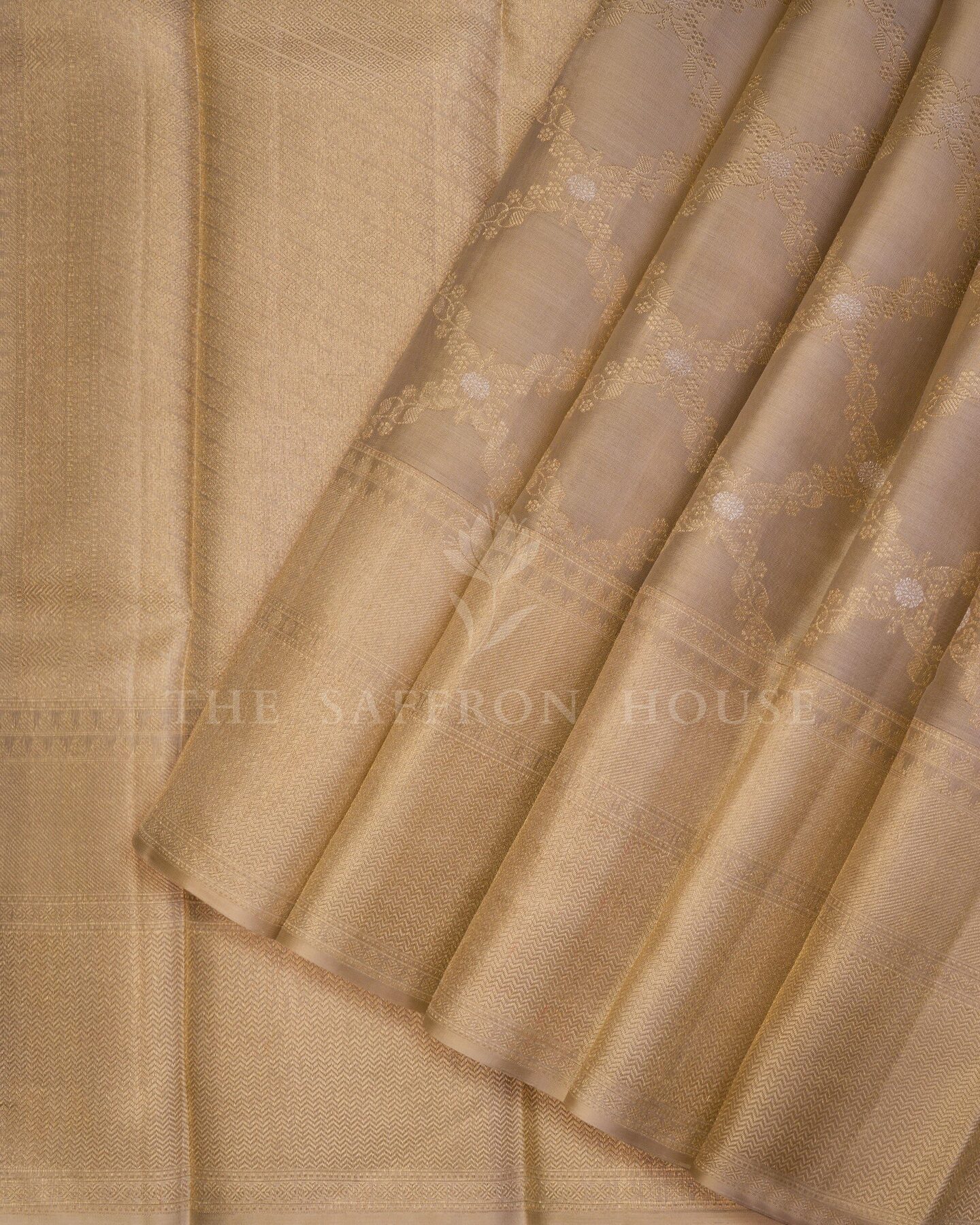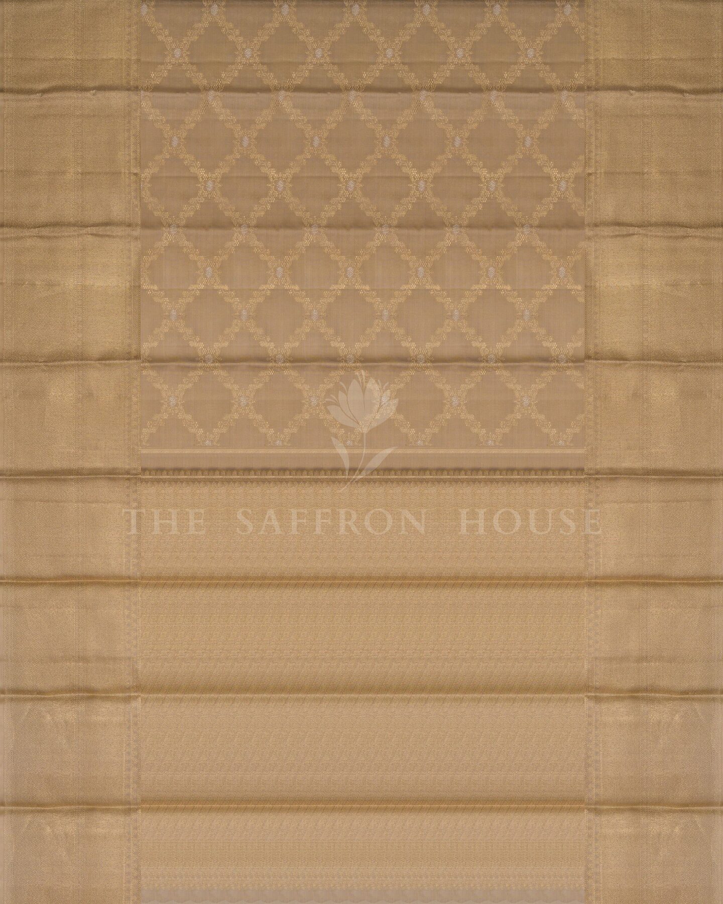 There is something about the interplay of beige and gold that feels both ancient and alive. This Handwoven Kanjivaram silk saree opens with radiant in its own quiet way, its surface shimmering with the unhurried rhythm of the loom.