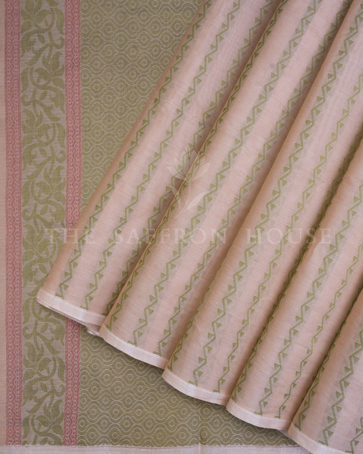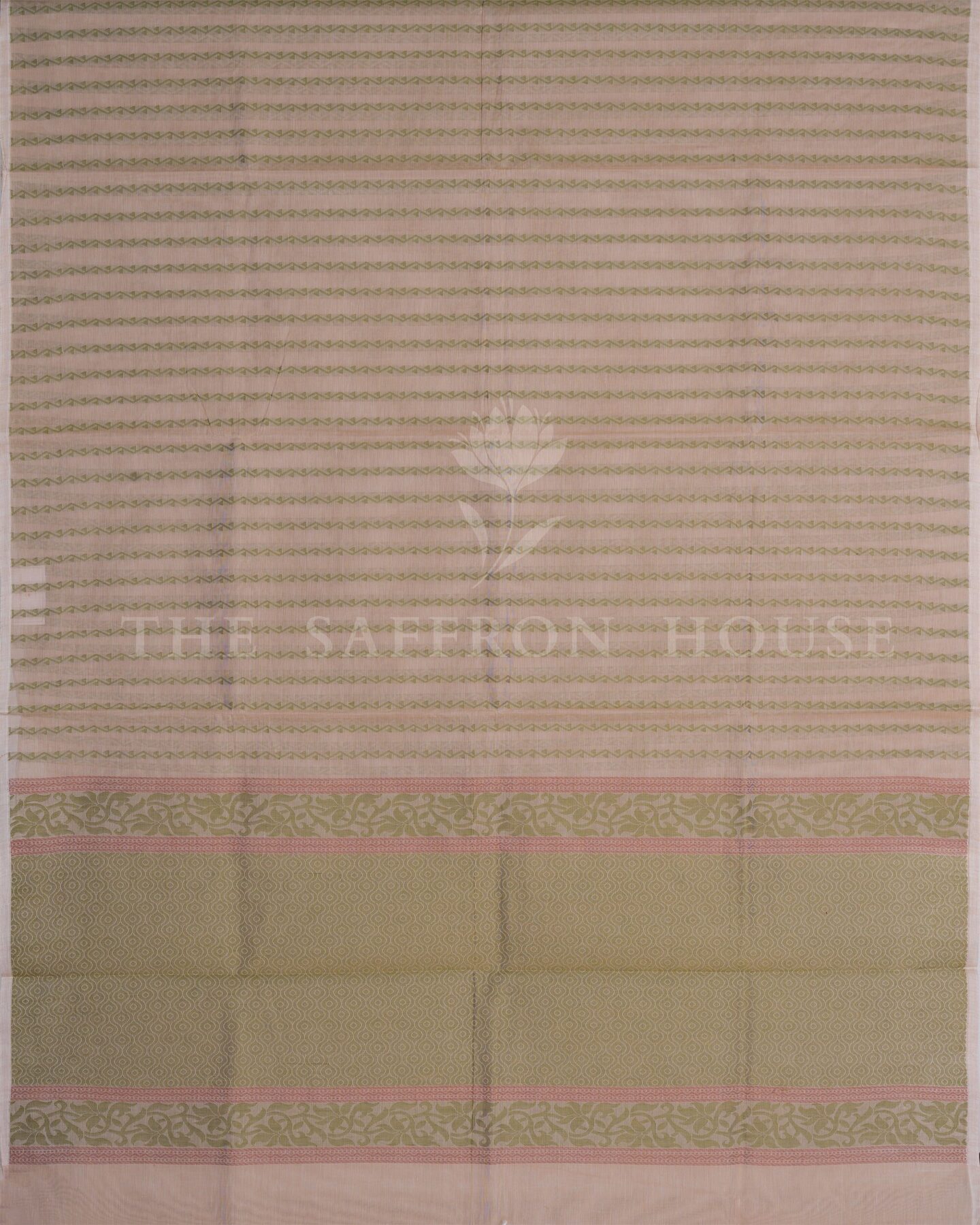There is something about the interplay of blush pink and sage green that feels both ancient and alive. This Jaal Kanjivaram silk saree opens with radiant in its own quiet way, its surface shimmering with the unhurried rhythm of the loom.