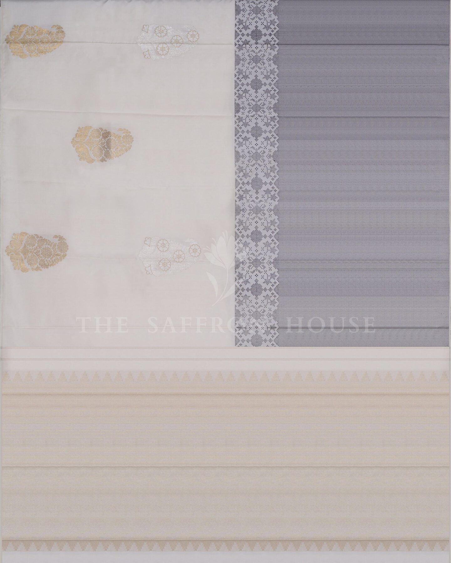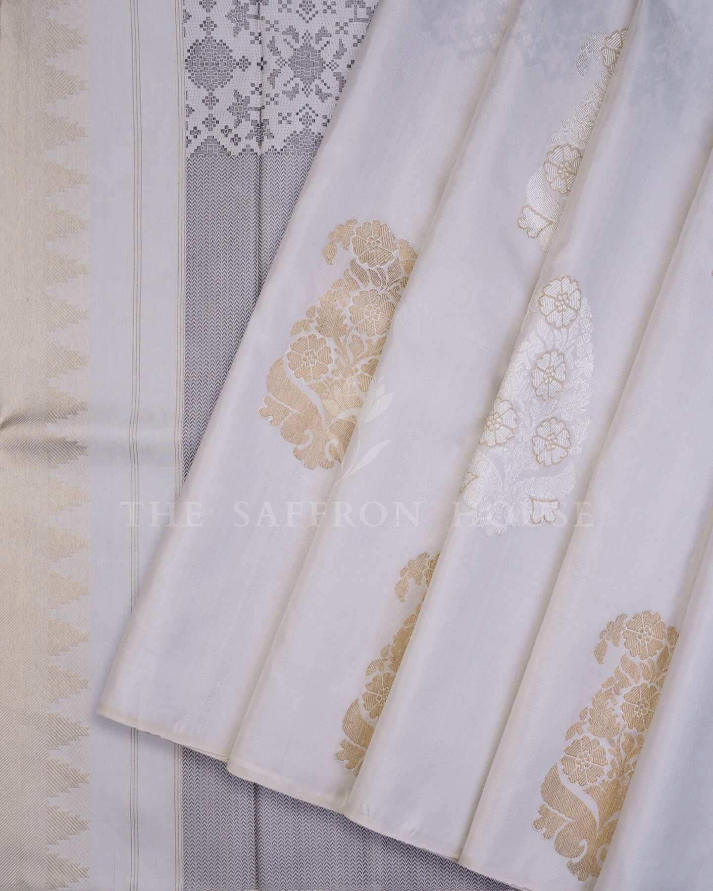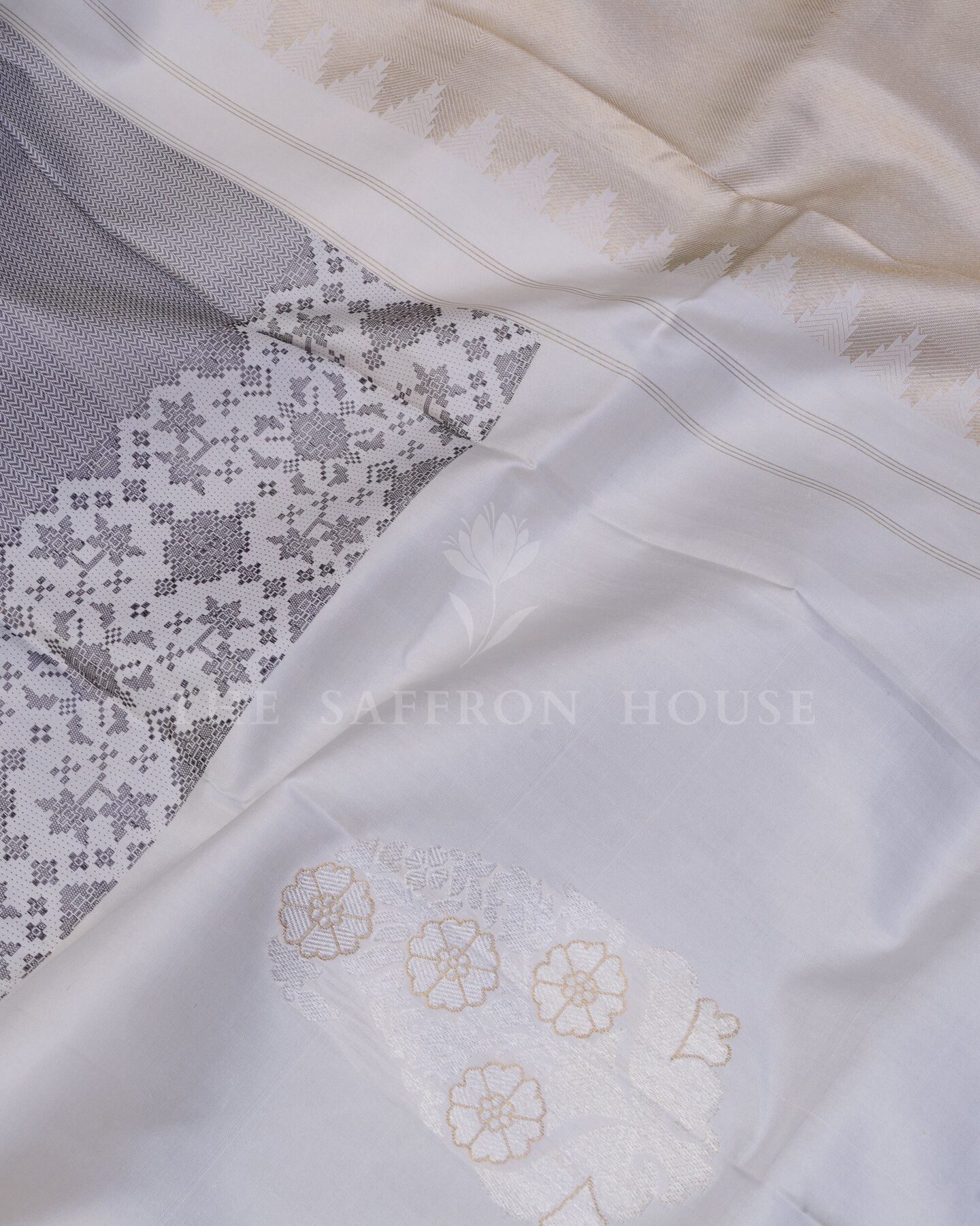 There is something about the interplay of white and grey that feels both ancient and alive. This Handwoven Kanjivaram silk saree opens with pure as freshly woven moonlight, its surface shimmering with the unhurried rhythm of the loom.